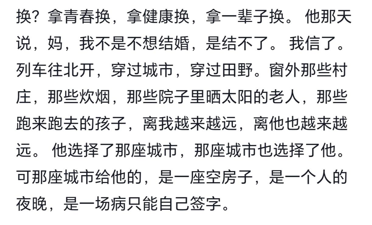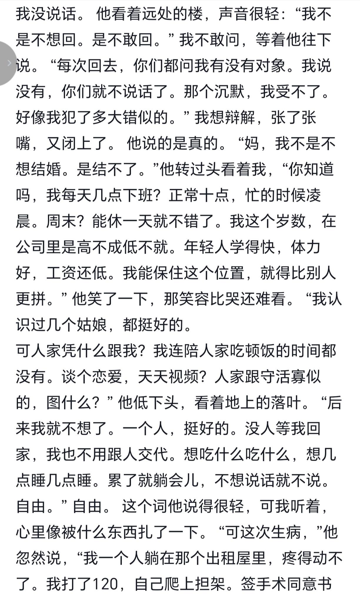刚读的这篇儿子42岁了还不结婚,妈妈从不理解到理解的文章,真的太戳人了。 上海那位42岁做互联网技术的儿子,漂在上海18年单身。他每天忙到凌晨,连陪姑娘吃饭的时间都没有,哪有空结婚。生病时一个人打120、签手术同意书,看着让人心酸。以前妈妈总催他,后来才明白他背后的难。父母催婚,不是为了面子和传宗接代,而是希望孩子以后有人爱、有人疼。 我们生活在一个和平的国家,怎么感觉还是这么累?孩子们也确实很不容易,不是不想回家,是回不了,不是不想结婚,是结不了。这也是现在很多年轻人的生活现状,拼尽全力的争取,想让自己的生活变得更好,同时也在争取的时候失去了很多属于自己的爱好和自由,或者更多,就像文中说的那样。 这篇文章我一字不差的读完,眼泪不由自主流下来了,不知道是心疼还是感同身受,也让我看到了年轻人不婚背后的无奈和父母的良苦用心。 此篇美文邀大家共赏,也许你也是其中纠结的一位,希望此文能解开你们的心结,亲人和睦。