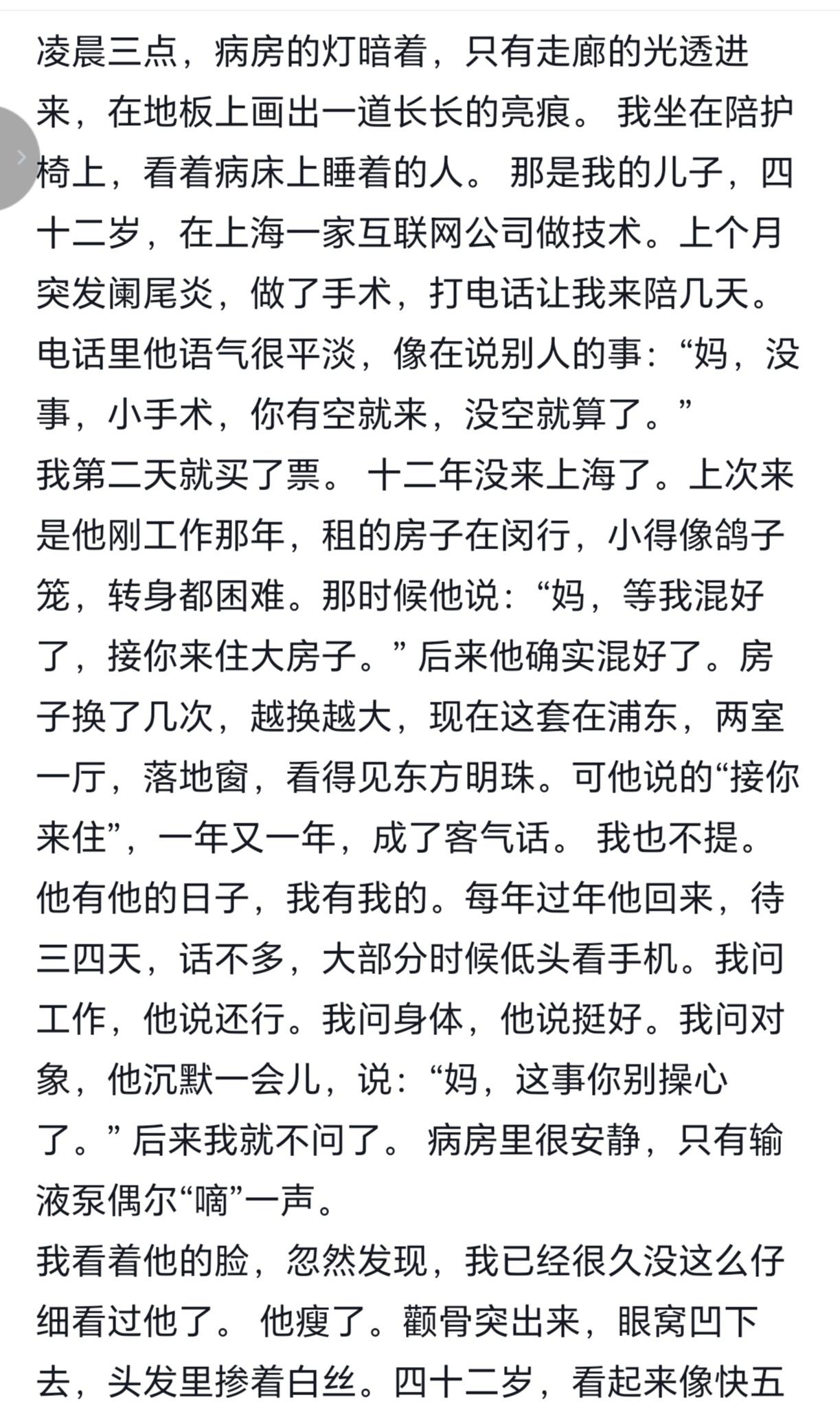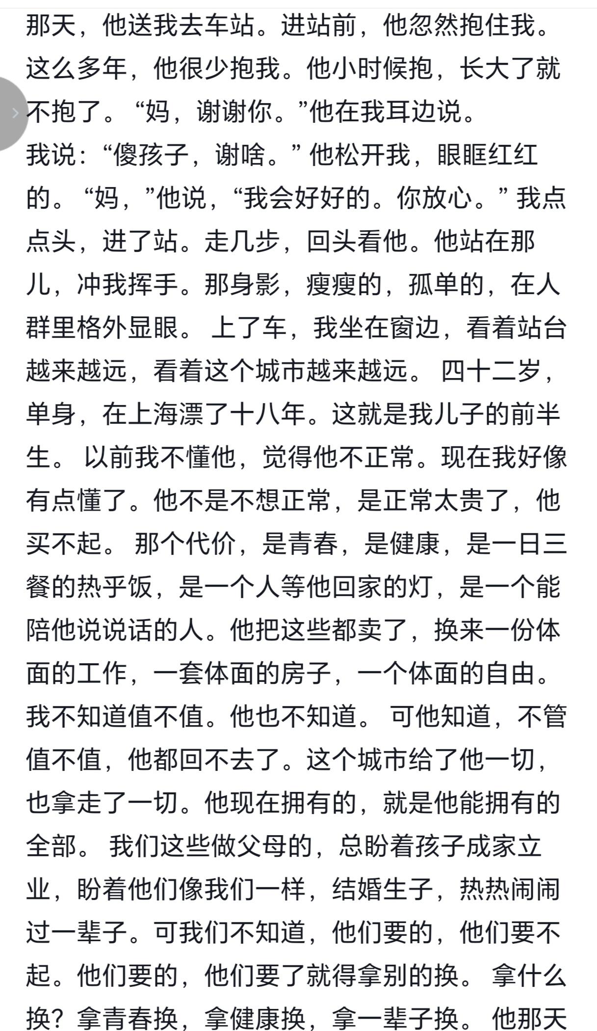 刚读的这篇儿子42岁了还不结婚,妈妈从不理解到理解的文章,真的太戳人了。 上海那