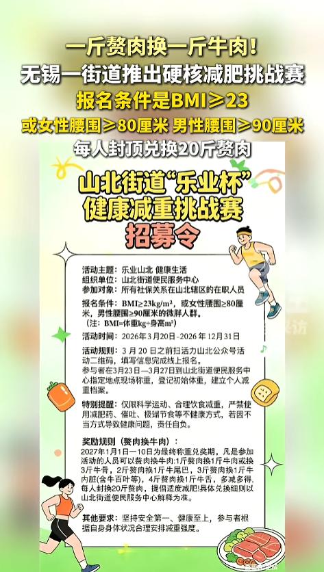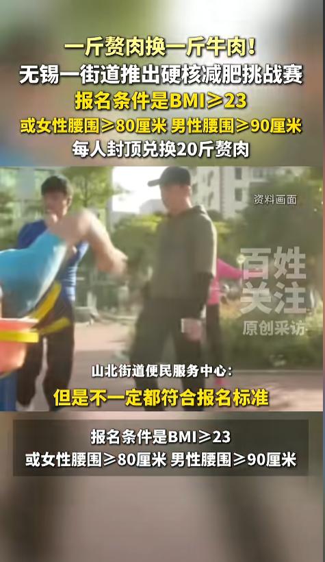 “天上掉馅饼啦!”近日,江苏无锡,某街道发布了一个减肥挑战赛,减一斤赘肉可以换一斤牛肉,减得多还可以换牛舌。兑换上限20斤赘肉。只要社保关系在辖区里面,符合减肥的报名条件,都可以参加。不用减肥药就行。网友:别人家的街道! 据媒体3月12日报道,该街道最近发布了一个为期十个月的减肥挑战赛,奖品也很奇特,牛肉,牛骨,牛舌等?减一斤肉就能换一斤肉,引得不少人,现在报名的已经有上千人了。 这个活动面向整个辖区,只要自己的社保关系在辖区里面。就可以进行报名。当然了,报了名还需要进行筛选,需要减肥的才能参加,本身就比较瘦的,和这个活动就无缘了。 筛选条件也很简单,BMI指数≥23,或者女性腰围≥80厘米,男性腰围≥90厘米,只要符合这个条件就行。但是减肥过程中,不允许使用减肥药,催吐、极端节食等会损害健康的减肥方式。 BMI指数又叫体重指数,它是用自己的体重(单位是千克)除以自己的身高(单位是米),再除以自己的身高(单位是米),得到的结果就是啦。 活动的奖励也很丰厚,活动结束时,减重1斤换1斤牛肉,或者三斤牛骨。减得多还能换别的东西,比如2斤赘肉换1斤牛尾,4斤赘肉换1斤牛舌等。每个人上限兑换20斤赘肉。 网友看后表示,这样的活动真好,极大地促进了减肥的热情。而且奖励的牛肉还能给人补充营养,还给大家伙省了钱,真是令人羡慕! 信息来源:《一斤赘肉换一斤牛肉!无锡一街道推出硬核减肥挑战赛,三天已有上千人报名》百姓关注