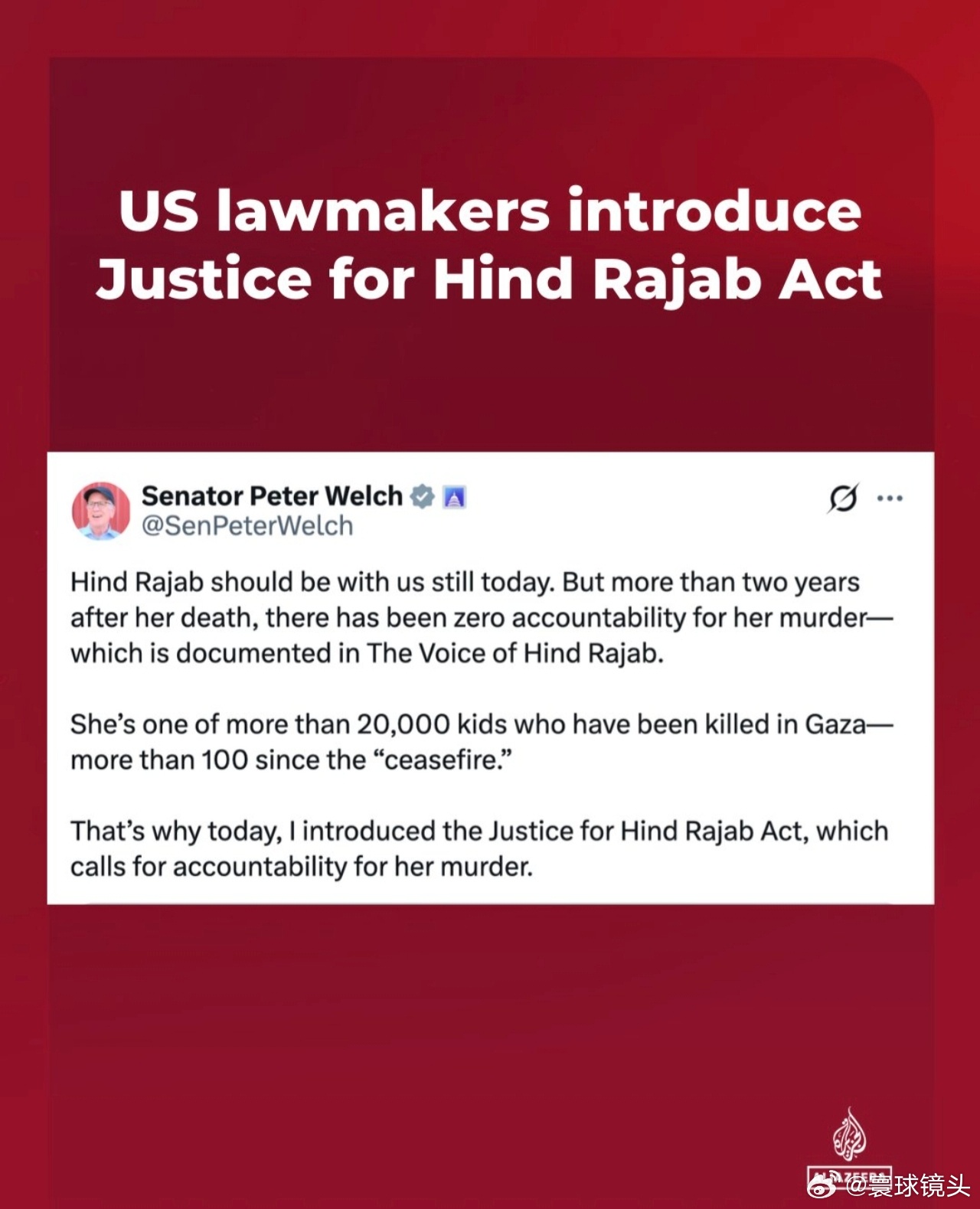 寰球镜头巴以冲突 五位美国议员提出了《为欣德·拉贾卜伸张正义法案》,呼吁对以色列军队在加沙杀害 5 岁巴勒斯坦女孩欣德·拉贾卜及其救援人员的事件进行调查,并要求对“更广泛的平民伤害模式”作出解释。