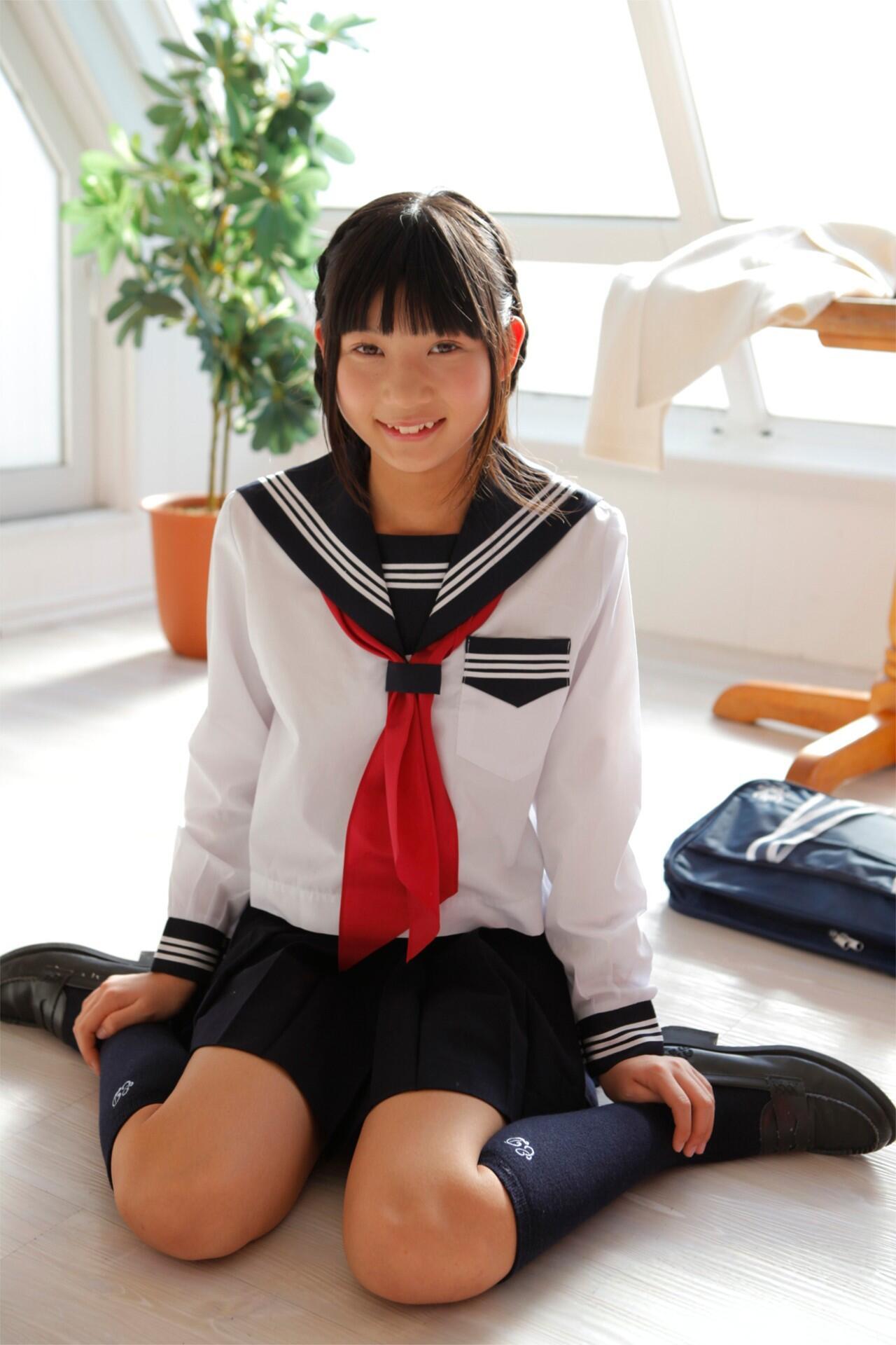 阳光下的可爱少女,穿着水手服,微笑着看向镜头。