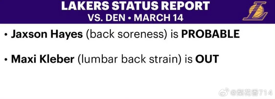 湖人这边——海斯(背部酸痛)、斯玛特(右髋挫伤)大概率复出!克莱伯(腹肌拉伤)明日缺席!