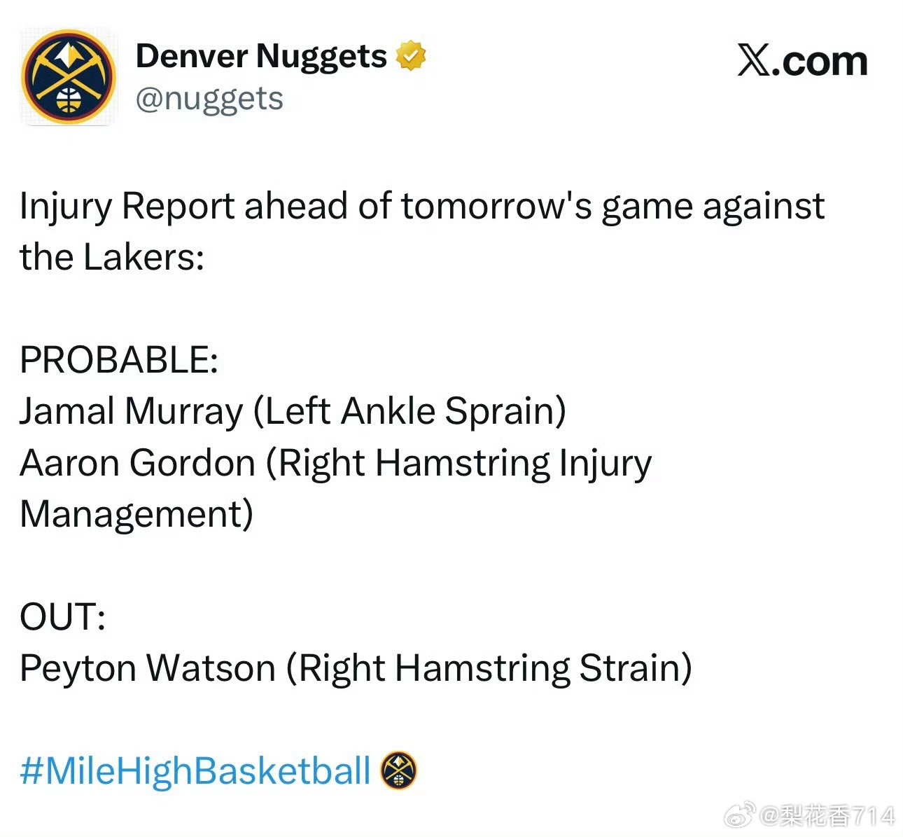 湖人掘金明日伤病名单来了!