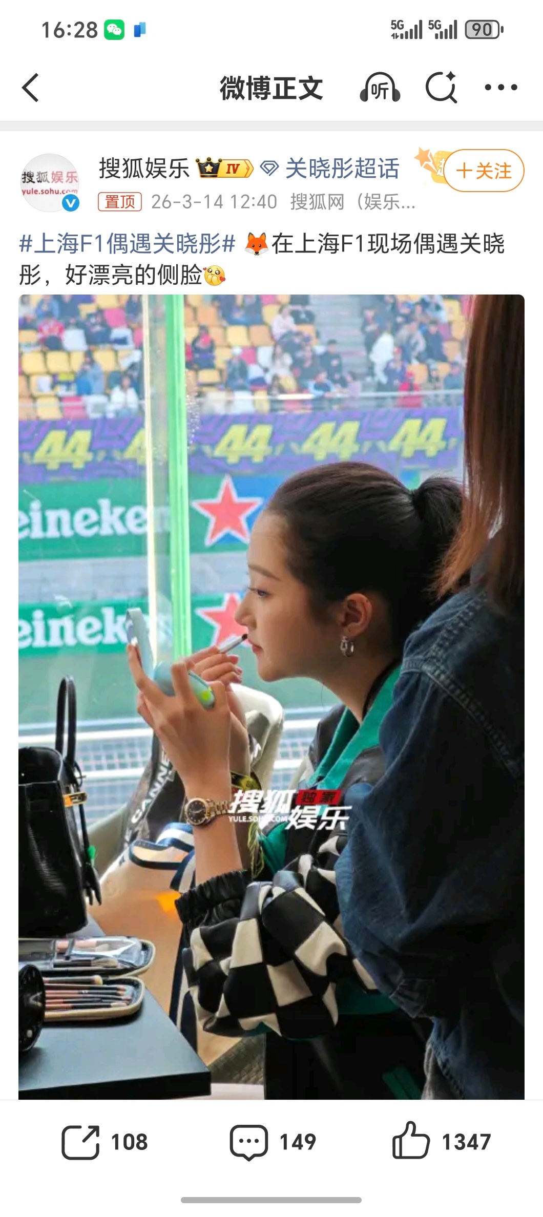 上海F1偶遇关晓彤太羡慕这两天能去F1现场的朋友了我们提前了好久抢票都是秒空明年一定要有机会去现场感受