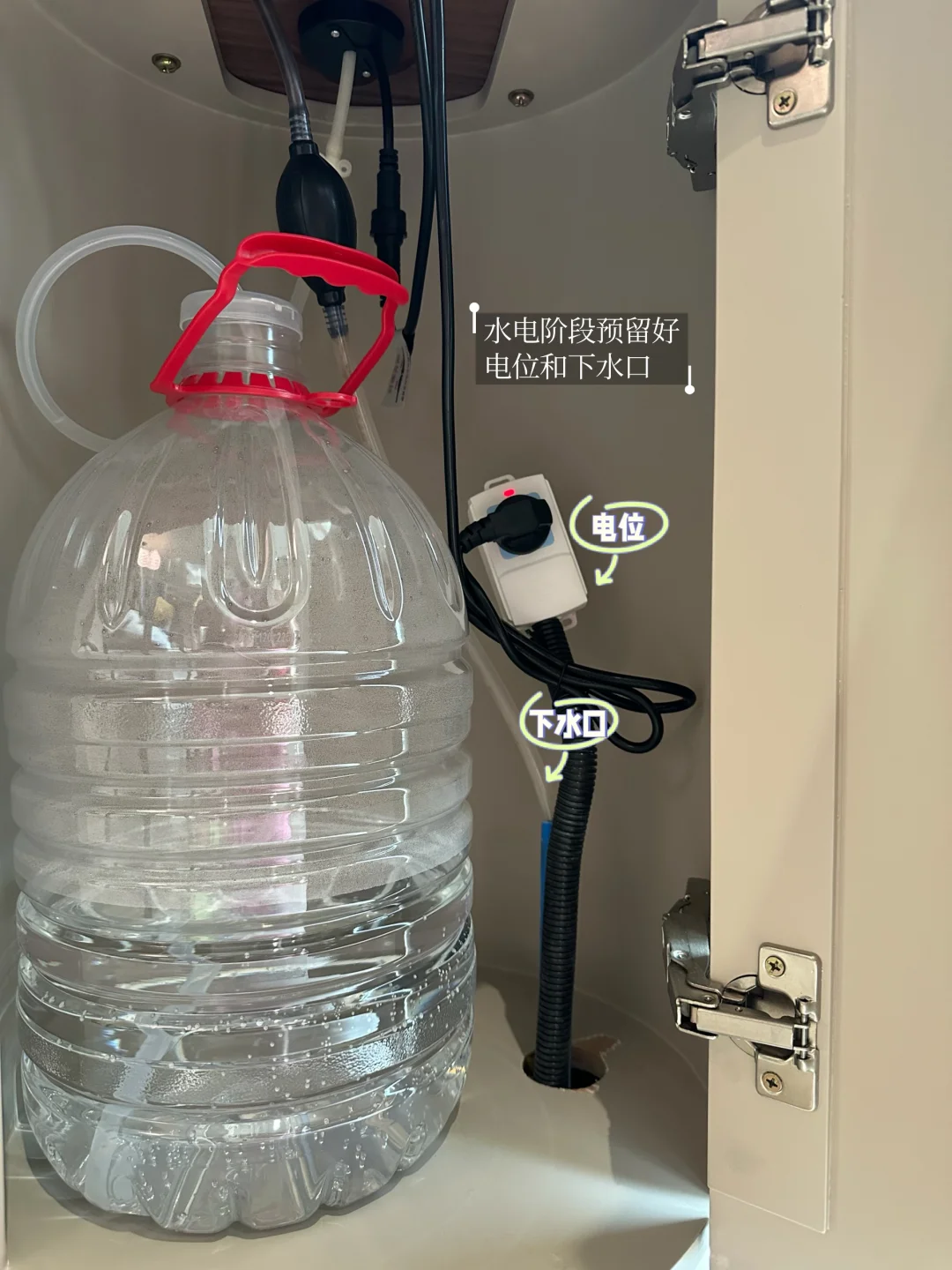 [种草R]提前规划水电位。这样可以避免电线牵得乱七八糟,也可以避免频繁倒废水的麻烦。这样就只需要在桌腿里放一个上水桶就好。