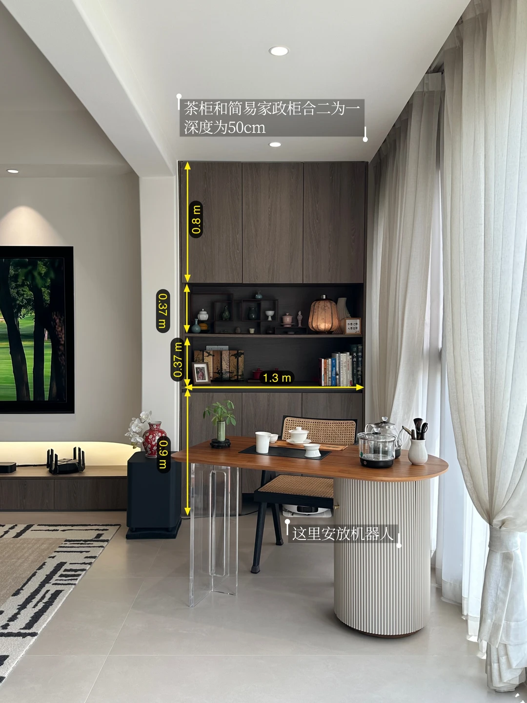 [种草R]茶柜和家政柜合二为一,下方门板镂空,给机器人留出空间。同时茶柜和主人位椅子留出1米左右的距离,这样机器人可以随时无障碍工作。