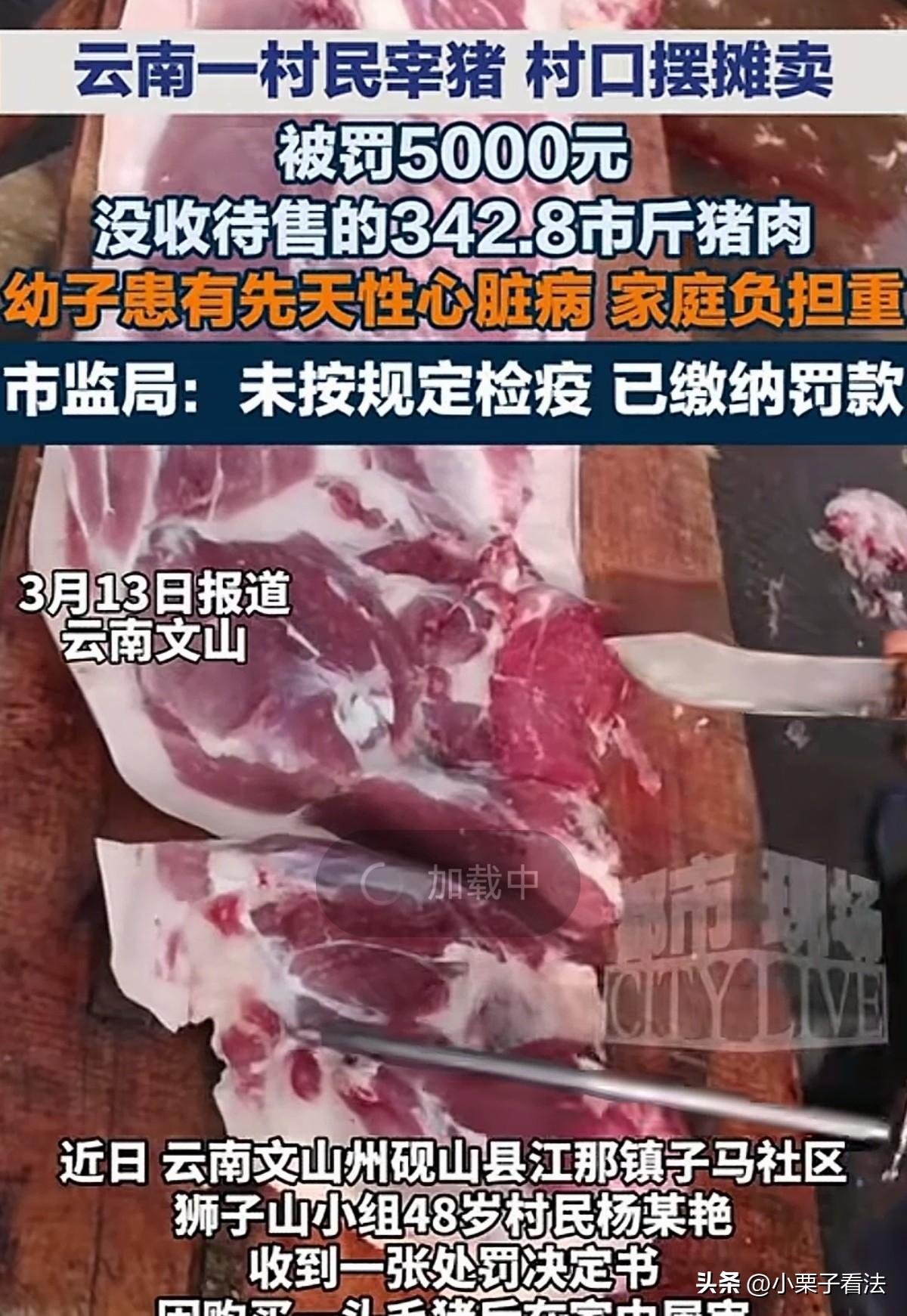 云南文山,砚山县的一48岁女子,家中老人丈夫都患有疾病,尤其幼小的儿子还患有先天性心脏病,生活重担压到她一人身上。为了赚钱她竟想出在市场买头毛猪,屠宰后去村口摆摊销售。谁知,市监局进行食品安全检查,发现她卖的猪肉未按规定检疫,随后将342.8斤猪肉没收,考虑女子的家庭情况和认罪态度,市监局秉持罚教结合原则减轻处罚,只罚了她5000元。女子悔不当初:这钱没赚来,让这个家庭更加雪上加霜! 杨某艳的日子,过得比村里大多数人都要艰难。 她丈夫身体不好,要常年吃药,老人年老体弱,也是疾病缠身,更可怜的是她小儿子是先天性心脏病。 小儿子从从出生到现在,看病、吃药、复查像一座大山,压得这个本就不富裕的家庭喘不过气。 家里的收入全靠几亩薄田,丈夫身体也不好,干不了重活,一家老小的开销、孩子的医药费,全都压在她一个女人肩上。 眼看着年关越来越近,家里连买年货的钱都没有,孩子的药也快断了,杨某艳每天愁得睡不着觉,总想找个法子多挣点钱。 杨某艳在乡亲们的闲聊中听到了赚钱的商机:他们都准备过年买到新鲜放心的土猪肉。 那何不自己买头毛猪屠宰卖肉,这样家里人也有肉吃,也可以从中赚钱钱给孩子买药? 在她看来,农村人好多自家养的猪杀了吃肉,吃不完的邻居也过来买,是再平常不过的事,压根不知道这里面还有严格的规定。 2026年1月12日,杨某艳揣着省吃俭用攒下来的钱,来到生猪市场,精心挑了一头肥猪拉回了家。 第二天一大早,天还没亮,她就起床忙活起来,烧水、杀猪、褪毛、分割猪肉,一个人忙前忙后,累得腰都直不起来。 整整一上午,这头猪被她处理得干干净净,一共出了358.8斤鲜猪肉,她心疼地给自己家留了16斤过年,剩下的342.8斤,全都用推车拉到了村口,摆起了简易的肉摊。 她心里盘算着,卖掉这头猪,除去成本,肯定能赚出给孩子买药的钱,一想到这里,她脸上挂着轻松的笑。 谁知她刚把肉摆好,市场监管部门的执法人员就来到了摊前,要对猪肉摊进行食品安全检查。 检查结果让杨某艳瞬间慌了神:她的猪肉上没有检疫印章,也拿不出任何检疫合格证明,属于违规销售未经检疫的肉类。 执法人员当场立案,扣押了她摊位上全部的342.8斤猪肉,看着自己一上午的心血被拉走,杨某艳站在原地,眼泪在眼眶里打转。 她反复跟执法人员解释,自己是真的不懂规定,觉得村里人也有杀猪的,不知道要进行检测啊!自己只是想赚点钱给孩子治病。 《食品安全法》第34条第1款第8项 :未按规定进行检疫或者检疫不合格的肉类,或者未经检验或者检验不合格的肉类制品,禁止生产经营。 杨某艳在家私宰生猪、摆摊销售,猪肉无检疫章、无检疫合格证明,完全符合本条“经营未按规定检疫的肉类”的违法情形 。 《食品安全法》第123条第1款第4项 :尚不构成犯罪的,由县级以上人民政府食品安全监督管理部门没收违法所得和违法生产经营的食品……违法生产经营的食品货值金额不足1万元的,并处10万元以上15万元以下罚款…… 食品安全关系千家万户身体健康和生命安全,未按规定进行检疫的猪肉存在较大安全隐患,危害群众食品安全。 杨某艳这才意识到事情的严重性,她吓坏了,积极配合主动交代违法事实。 市场监管部门了解到了杨某首次违法、积极配合调查,家里幼子患先天性心脏病,经济负担极重,生活十分困难。 按规定,她销售未经检疫的肉类,要处10-15万以下罚款,可考虑到她的特殊处境,部门秉持罚教结合的原则,最终做出了减轻处罚的决定,只处5000元罚款。 杨某艳知道自己确实违反了法律,也明白食品安全是关乎所有人的大事。这已是法外开恩了,没提出申辩。 尽管5000元对她来说是一笔巨款,是孩子好几个月的医药费,但她还是东拼西凑,按时把罚款交了。 这件事很快在村里传开,有人觉得杨某艳太可怜,家境困难又是初犯,不该罚这么重。 也有人说,未经检疫的猪肉有安全隐患,法律底线不能破。 而杨某艳只是默默回到家里,看着生病的孩子,心里满是无奈和懊悔。 她不是故意违法,只是被生活逼得走投无路,也因不懂法律,踩了不该踩的红线。 杨某艳的遭遇,既让人同情她的难处,也提醒着每一个人,生活再难,也不能触碰法律红线,而基层的普法与帮扶,或许能让这样的无奈,少一点,再少一点。 对此您怎么看?