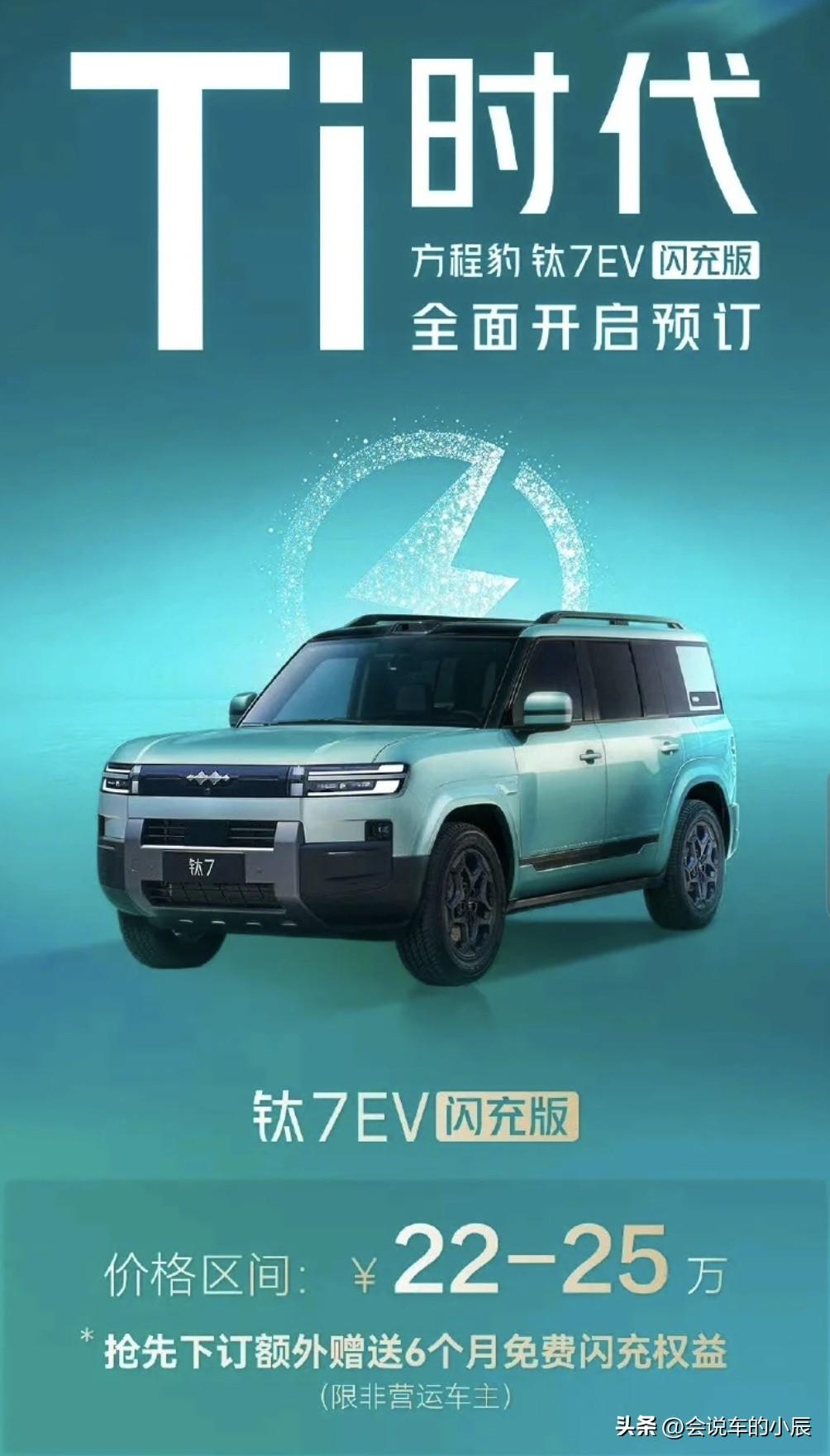 充电5分钟,续航400里!方程豹钛7 EV闪充版22万起,全球首款闪充大方盒来了! 比亚迪闪充家族再添猛将!全球首款闪充纯电大方盒——方程豹钛7 EV闪充版今日正式开启预订,预售价22~25万元,瞬间引爆车圈! 新车搭载第二代刀片电池+兆瓦闪充技术,补能效率直接拉满:充电5分钟,续航400里!彻底告别续航焦虑,让纯电出行比加油更快。更重磅的是,抢先下订即享6个月免费闪充权益,全国超4500座闪充站任你充,279城覆盖,走到哪里都有家! 外观方面,硬朗方盒造型极具辨识度,提供7款外观色+3款内饰色可选,霸气与时尚兼具。大空间座舱搭配智能生态系统,科技感与实用性双双在线。 22万起,就能拥有一台全球首款闪充大方盒,还送半年免费充电——方程豹钛7 EV,这是要卷翻纯电SUV市场!预订通道已开启,手慢无! 方程豹钛7 闪充纯电 22万起预售