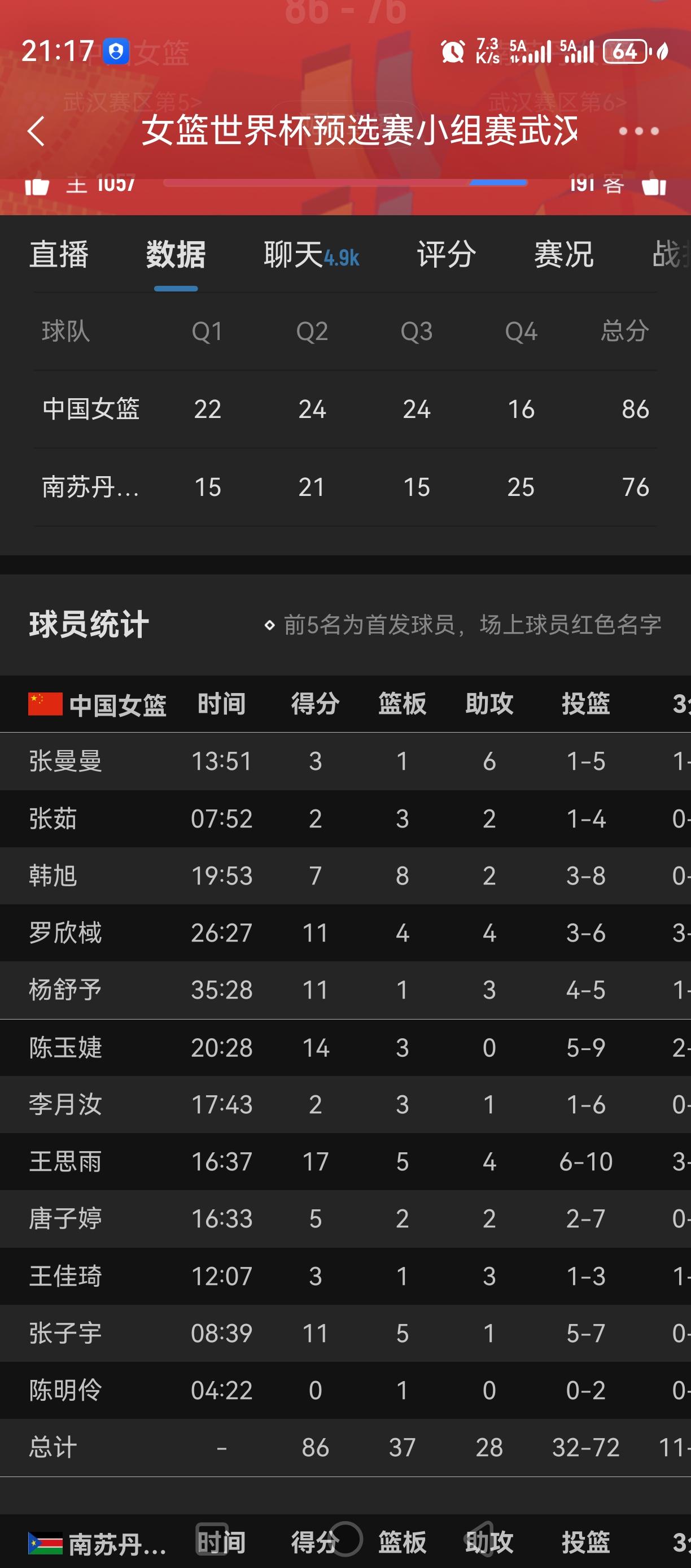 86:76,中国女篮赢了南苏丹10分!这场好的地方是传导和内外配合比上一场好! 但三分还是不稳定!失误也多! 感觉磨合还是有欠缺! 只能一场一场调了! 后面打捷克和巴西是关键战!