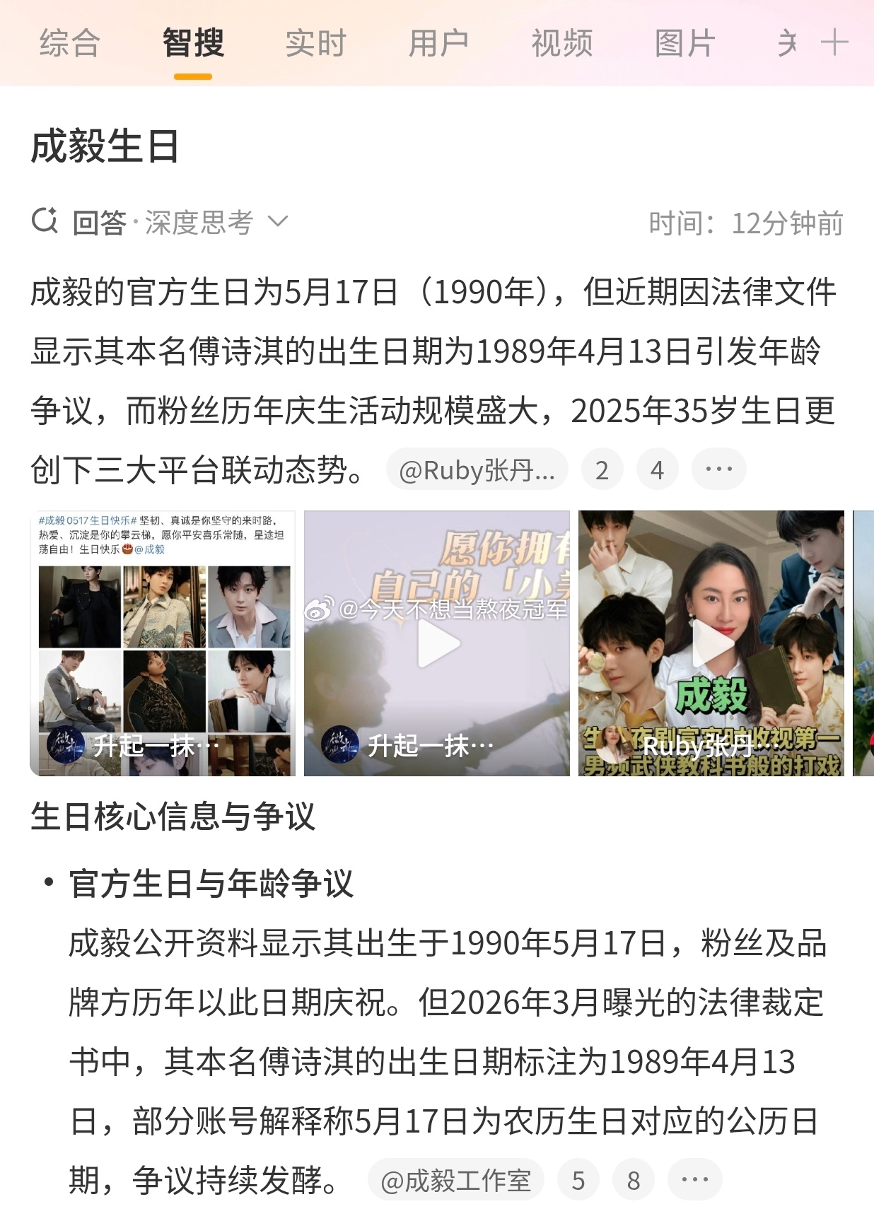 成毅(傅诗淇)的裁定书上写的89年出生,而且阳历生日也和互联网上显示结果不一样,