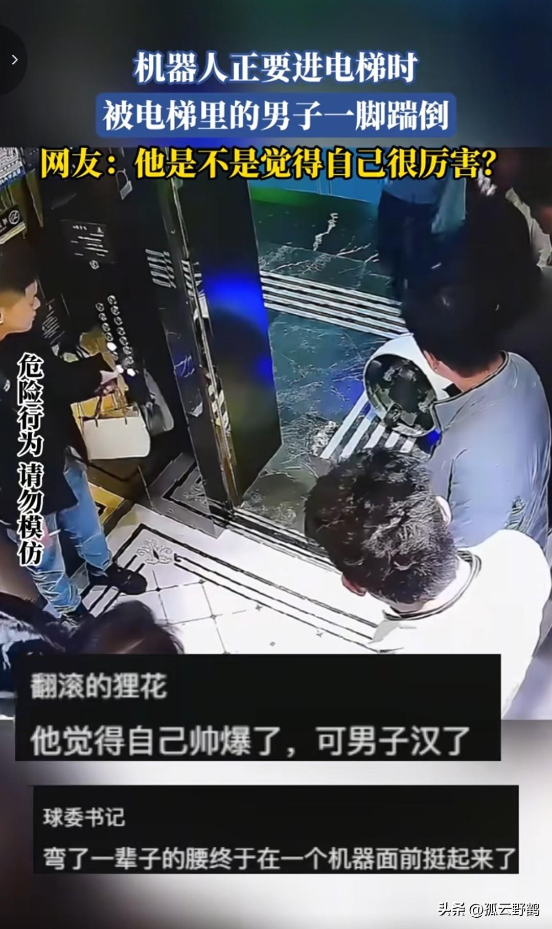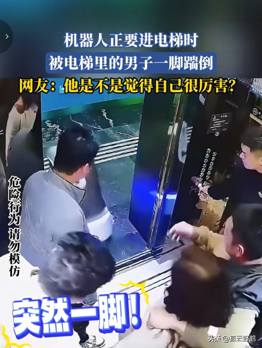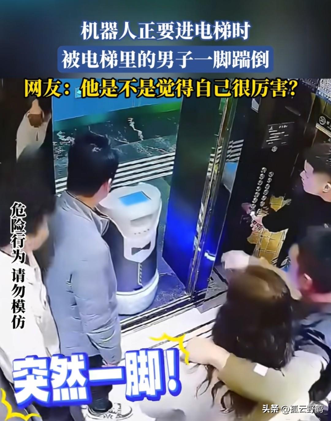 机器人正要进电梯被男子一脚踹倒,网友: “他是不是觉得自己很厉害?” 近日,一段监控显示: 服务机器人正按程序执行任务,缓慢靠近电梯。此时,电梯里一名穿着光鲜的男子搂着女伴,眼看机器人要进电梯,他突然抬起脚,对着机器人猛踹过去。机器人重心不稳,“哐当”一声翻倒,男子却像没事人一样,搂着女伴在电梯里笑呵呵,这一幕,可把电梯里的其他几名男子看懵了。 但却没有一个人出电梯将机器人扶起来,不知道是不是机器人能控制电梯,电梯里的人不断按关门,电梯始终都没有关门,直接后来人将机器人扶起来。 进了电梯后,电梯才关门运转。 这段监控视频曝光后,引发广泛网友们热议: “为了在女人面前装威风,连机器人都欺负?这算什么本事?” 也有网友说: “机器人招他惹他了?明明是服务大家的,被他一脚踹出了屈辱感。” 还有网友说: “这哪是踢机器,是想在别人及女伴面前刷‘存在感’,结果暴露了自己的没素质。” 踹机器人的男子,或许觉得“踢一下没什么”,甚至能在女伴面前“耍个帅”。但在旁人眼里,这一脚踢掉的,是他自己的体面。 不但如此,如果机器人有损坏,该男子也跑不了,天价维修费够他喝一壶。 之前就有一个案例,北京一男子在酒店坐电梯时也是将机器人踹倒在地,最后赔偿了4500元维修费。