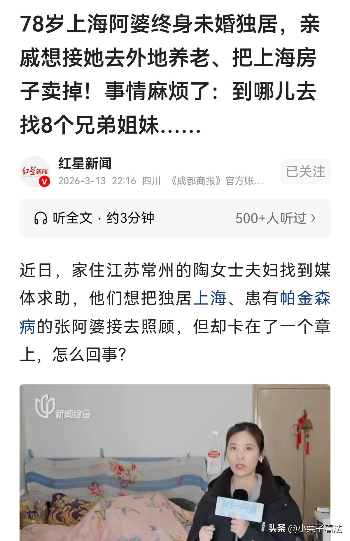 上海闵行,78岁老太一生未婚,无儿无女,独居在一套老房中。几年前她得了帕金森病,需要人照顾,她每个月雇保姆6800元,可她退休金5000元。老太答应由的远在外地的外甥养老。不够的部分都是外甥给补贴,可老太病情越来越重,外甥夫妇想将老人房子卖掉,把她接到身边照顾,可外甥要想成为老太的监护人,必须要老太上面的8个兄弟姐妹签字同意,外甥犯难了:那些人有的去世了有的子女在国外,怎么凑齐盖章啊? 最近,江苏常州的陶女士和丈夫徐先生,愁得睡不着觉。 夫妻俩特意赶到上海,想把独居的78岁姨妈张阿婆接回常州养老,好好照顾她的晚年。 可这件看着合情合理的孝心事,偏偏卡在了一枚小小的公章上,而问题的根源,是阿婆那8个几乎失联的兄弟姐妹。 徐先生是张阿婆的亲外甥,几年前,阿婆所在的居委会辗转联系上他时,老人的身体已经大不如前。 帕金森病一步步侵蚀着她的身体,从手脚发抖到无法行走,最后连说话都变得含糊不清。 经法院认定,阿婆属于限制民事行为能力人,生活起居全靠保姆照料。 阿婆每月退休金只有5000元,可请住家保姆一个月就要6800元,这中间的差价,徐先生夫妇默默补贴了好几年,从没抱怨过。 看着阿婆住在没有电梯的老房子里,整日被困在房间里,夫妻俩心里不是滋味。 他们和阿婆反复沟通,老人清醒时明确说过,愿意跟着外甥夫妇去常州养老,让他们全权负责自己的晚年生活。 为了让阿婆住得舒心,夫妻俩盘算着把上海的房子卖掉,用卖房的钱支付养老、医疗和保姆费用,剩下的存起来给老人应急。 可理想很丰满,现实却很骨感。阿婆是限制民事行为能力人,没办法自己签字办理房产交易,必须由法定监护人代为处理。 徐先生向法院申请担任阿婆的监护人。 《民法典》第28条规定,无民事行为能力或限制民事行为能力的成年人,其他愿意担任监护人的个人或组织担任监护人需经被监护人住所地的居委会、村委会或民政部门同意。 而居委会迟迟不肯盖章,原因让所有人都无奈,张阿婆在家排行老9,上面还有8个兄弟姐妹。 这些年家族成员分散各地,往来极少,有的已经去世,有的子女定居国外,连联系方式都找不到,更别说征求他们的意见了。 居委会的工作人员也犯了难,这是他们第一次遇到这样的情况。 一边是真心实意照顾老人的外甥夫妇,一边是复杂的亲属关系。 万一盖了章,日后突然冒出其他亲属主张权利,或是外甥夫妇拿到监护权后疏于照顾,老人的财产和晚年谁来负责? 出于保护老人财产安全的顾虑,居委会只能慎重再慎重,希望法院先出面查清8位兄弟姐妹的情况,再确定监护权归属。 陶女士夫妇理解居委会的顾虑,可看着阿婆日渐虚弱的身体,他们心急如焚。 3月13日,居委会负责人特意上门看望阿婆,老人虽然口齿不清,但意识格外清醒,拉着工作人员的手,断断续续地表达:愿意让徐先生处理房子的买卖,跟着外甥去常州养老。 老人的心愿很简单,就是想有个亲人陪在身边,安安稳稳走完最后一段路。 这件事陷入了一个让人无奈的“死循环”。 律师说,这是基层最常见的养老监护困境:法律规定要居委会同意,可法院没有居委会的材料又难以立案,两边僵持,最受苦的是老人。 她曾见过不少老人,在漫长的调查和等待中,没能等到妥善的安置就离世了。 律师坦言,居委会的谨慎可以理解,但不能因为怕担责就止步不前。 出具同意书后,居委会依然有监督职责,一旦发现监护人侵害老人权益,随时可以申请撤销监护权。 法律的初衷是保护老人,而不是让善意卡在流程里,让孤苦的老人无人照料。 如今,徐先生夫妇还在为阿婆的监护权奔波,居委会也在积极协调法院调查亲属情况。 有人说,其实很好解决,由居委会、亲戚和老人三方签协议,房子卖了,钱由政府监管,支付亲戚照顾老人的费用。 亲戚只要能善待老人送终,老人去世后其剩余遗产由亲戚继承。否则,居委会有权收回亲戚对老人的监护与继承权。 有人说,居委会没这个权利,要政府出面授权啊,政府部门跟街道办、居委共同监督…… 有人说,为啥非要卖掉上海房?外甥把老人接过去,把上海房子出租就好了,租金都足够养老了吧! 有人反驳:不趁老人在世时办妥,老人百年以后涉及到继承权就更难办了! 大家都在等一个结果,等阿婆能早日离开空荡荡的老房子,去常州过上有人陪伴、有人照料的安稳日子。 对此您怎么看?