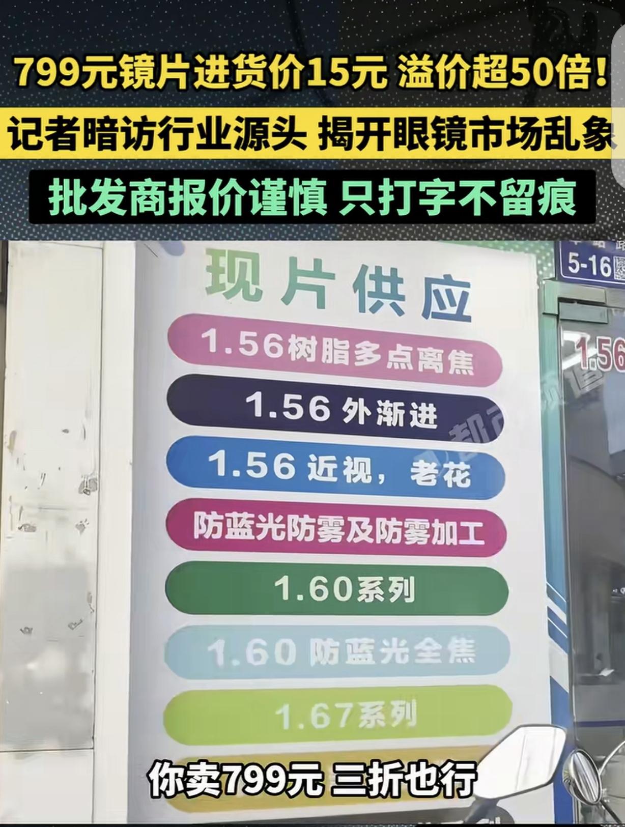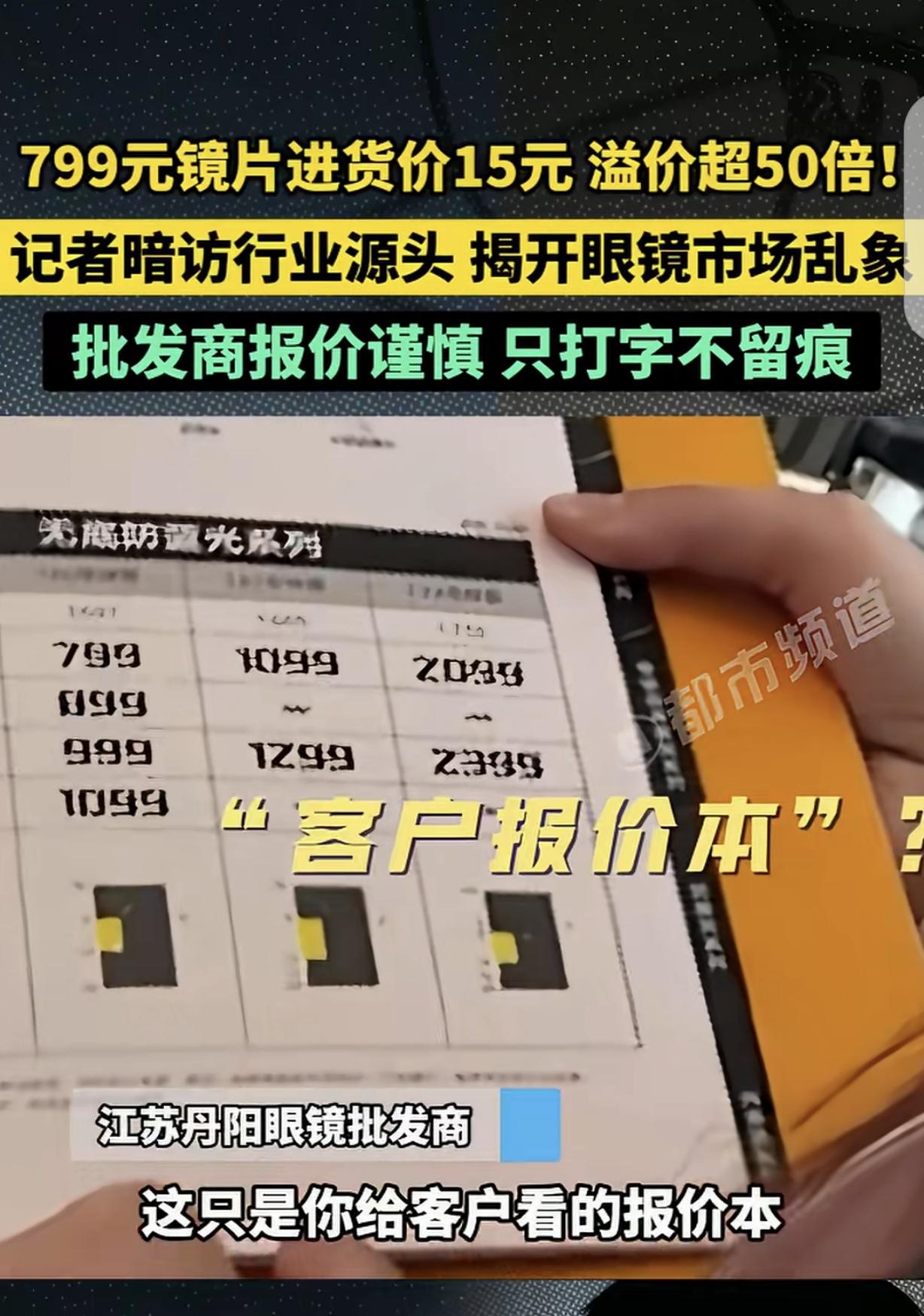 “令人咋舌!”江苏丹阳,一男子暗访,发现眼睛的镜片进货价15元,而眼镜店却标价799元,直接溢价超50倍,惊的他目瞪口呆,原来消费者被宰了这么多年。而批发商报价特谨慎,只打字不留痕,说799的镜片打对折也行,打3折也行,即使打3折,也能卖240元,零售价比进货价也翻了16倍。批发商还承诺给男子2个报价本,一本专门给顾客看,忽悠他们。行业顺口溜:20元的眼镜,200元卖人情,300元卖交情,400元卖行情。 一男子是记者,他发现市场配眼镜特别贵,少则几百,贵则几千,大家压根承受不起,觉得这其中一定是暴利。 于是,男子决定去眼睛批发市场,撕开眼镜行业那层遮羞布,让大家看到这个行业令人咋舌的暴利真相。 可男子即使做了思想准备,当他深入调查眼镜行业时,真相还是让他瞠目结舌。 他了解到,眼睛的镜片进货价竟然低至15元,可当这些镜片到了眼镜店,标价却直接飙升到了799元,溢价超过了50倍。 这意味着多年来,消费者一直在为眼镜支付着远超其实际成本的高昂价格。 男子进一步与批发商接触,发现批发商在报价时格外谨慎。他们交流几乎只通过打字,生怕留下任何痕迹。 批发商告诉男子,那标价799元的镜片,打对折卖没问题,打3折也能卖。 就算按照3折来算,零售价也高达240元,相比15元的进货价,依旧翻了16倍。 这巨大的利润空间,让人不禁倒吸一口凉气。 更让人震惊的是,批发商还承诺给记者提供2个报价本。一本是专门给顾客看的,目的就是为了忽悠消费者。 在这个报价本上,各种镜片的价格被标得虚高,让消费者在不明就里的情况下,心甘情愿地掏出更多的钱。 而另一本报价本,才是真正反映镜片实际价格和批发商操作空间的。 在眼镜行业,还流传着这样一句顺口溜:“20元的眼镜,200元卖人情,300元卖交情,400元卖行情。” 这句看似调侃的话,却道尽了眼镜行业的潜规则。 商家利用消费者对眼镜行业的不了解,通过虚高的价格来获取巨额利润。 他们把人情、交情、行情都当成了抬高价格的借口,却全然不顾消费者的利益。 对于消费者来说,眼镜是日常生活中的必需品,尤其是对于那些视力不好的人来说,更是离不开它。 然而,他们却在这个看似普通的消费行为中,被商家狠狠地宰了一刀。 他们花费了大量的金钱,却可能只是买到了一个成本极低的产品。 有人说,很多人压根没有成本概念就觉得贵,如果知道各种流通环节,就知道价格为什么这样了。就跟蔬菜果农出出园子几毛,到市场大几块一样。 还有人说,老公已经在网上配眼镜好几年了。先去眼镜店自费查参数,再把参数发给网上眼镜店,然后一副眼镜共花费一百多,他说一模一样,特别适合。 《价格法》第14条规定,经营者不得利用虚假或者使人误解的价格手段,诱骗消费者进行交易。 眼镜店虚高定价、采用双报价本误导消费者,属于价格欺诈行为,损害消费者知情权与公平交易权。 消费者可据此主张3倍赔偿,相关部门也应依法予以行政处罚。 对此,你怎么看?