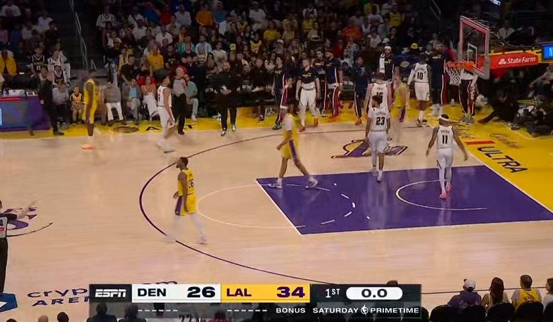 卡位战刺激!第一节结束,湖人34-26领先掘金8分,熟悉的味道。 东契奇12分5