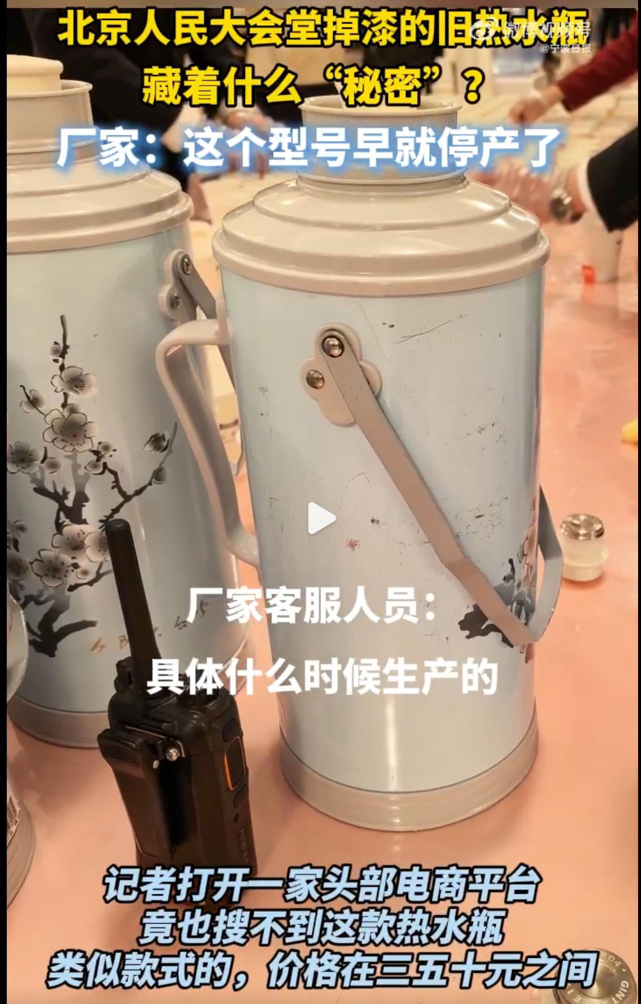 人民大会堂的热水瓶用了30年! 两会期间,当一个个“长枪短炮”瞄准会场之时,一只老式热水瓶,却让记者倍感好奇。经询问得知,人民大会堂这批热水瓶,已用了30多年。 有一说一,那个年代设计的暖水瓶真的容量很大,比现在的耐用。