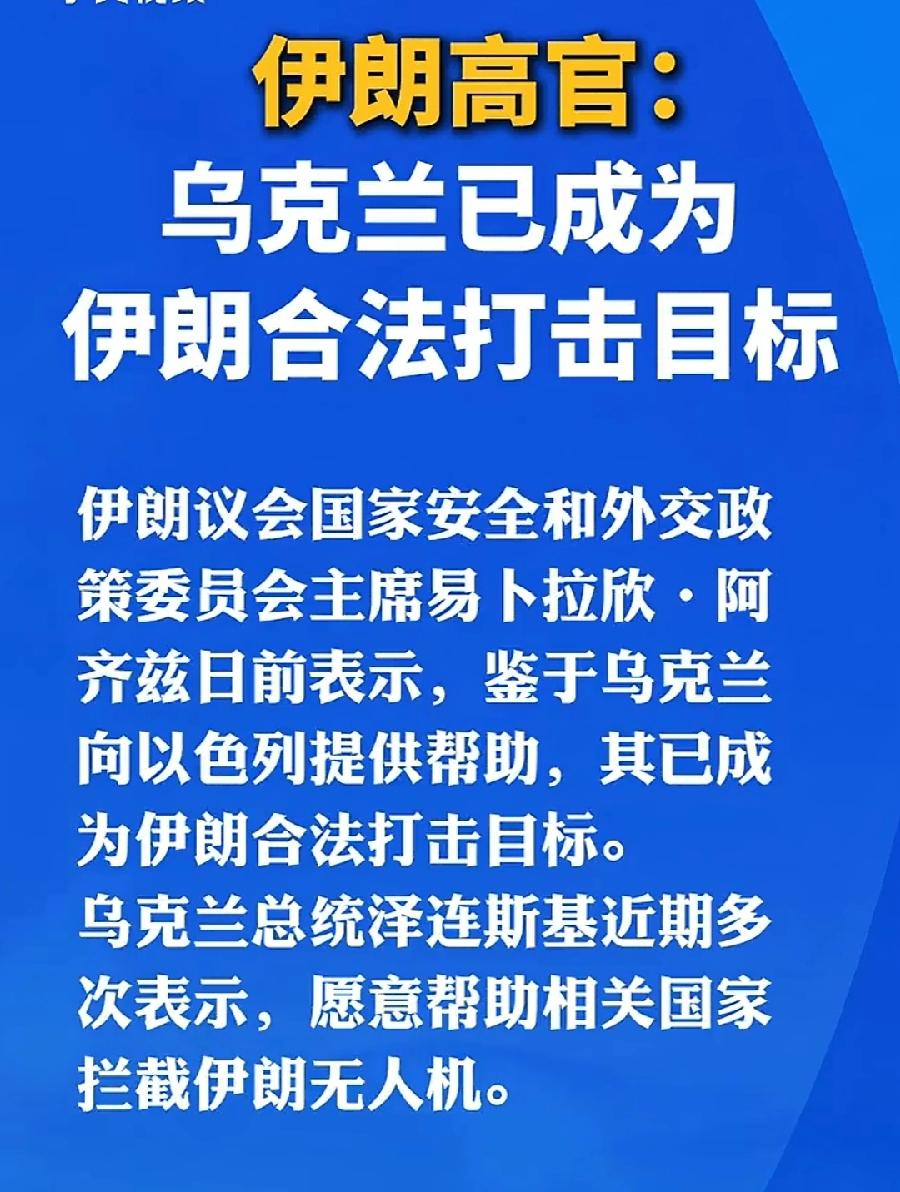 伊朗打急眼了,连乌克兰也要打?乌克兰只是向以色列、中东国家,提供无人机防御系统,这是防御支持,就成为合法打击目标了?那泽连斯基反怼得有道理,之前伊朗向俄罗斯提供无人机攻击乌克兰,还是攻击支持,乌克兰也没说要打伊朗,这个节骨眼,伊朗必须要冷静,不能到处树敌!
