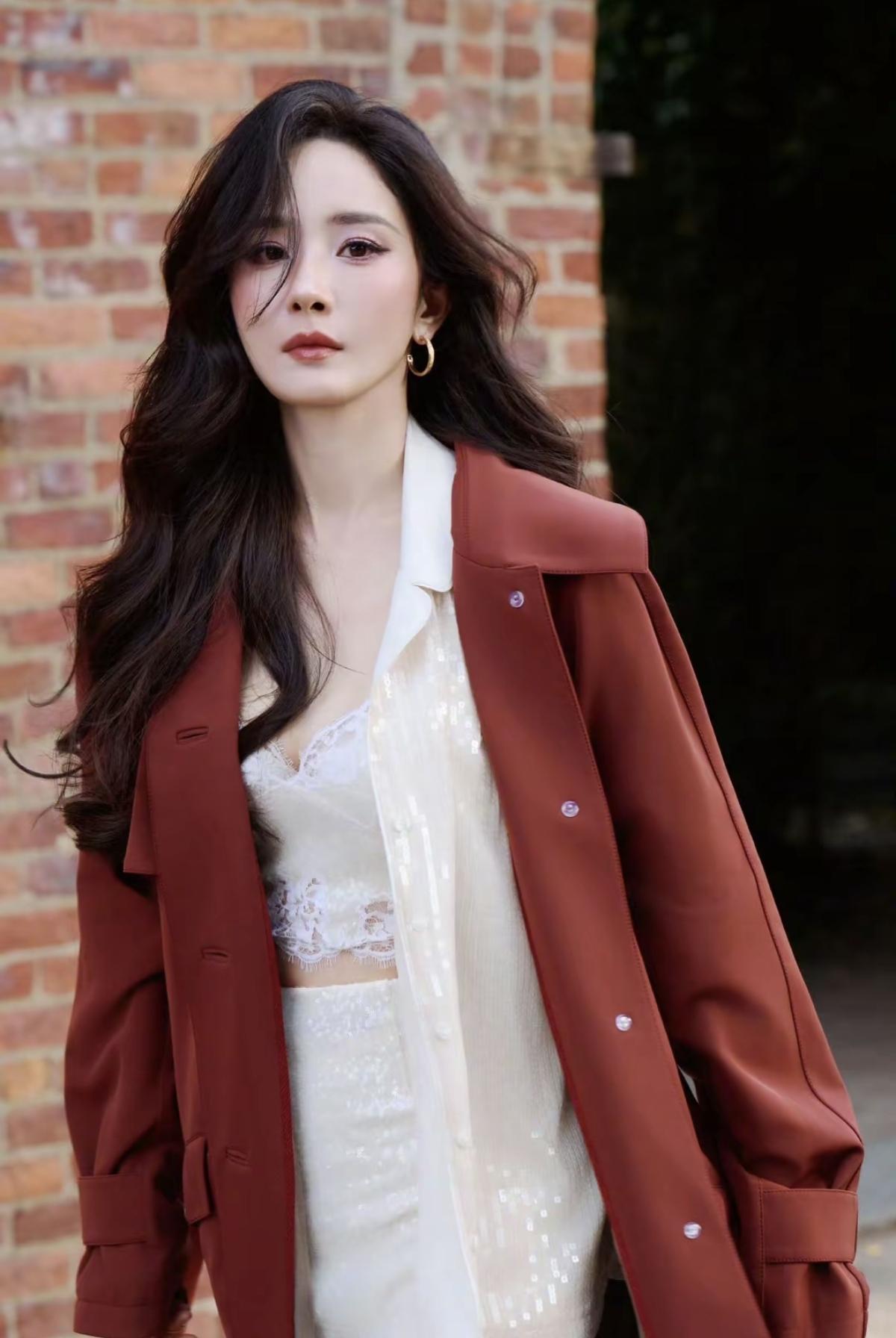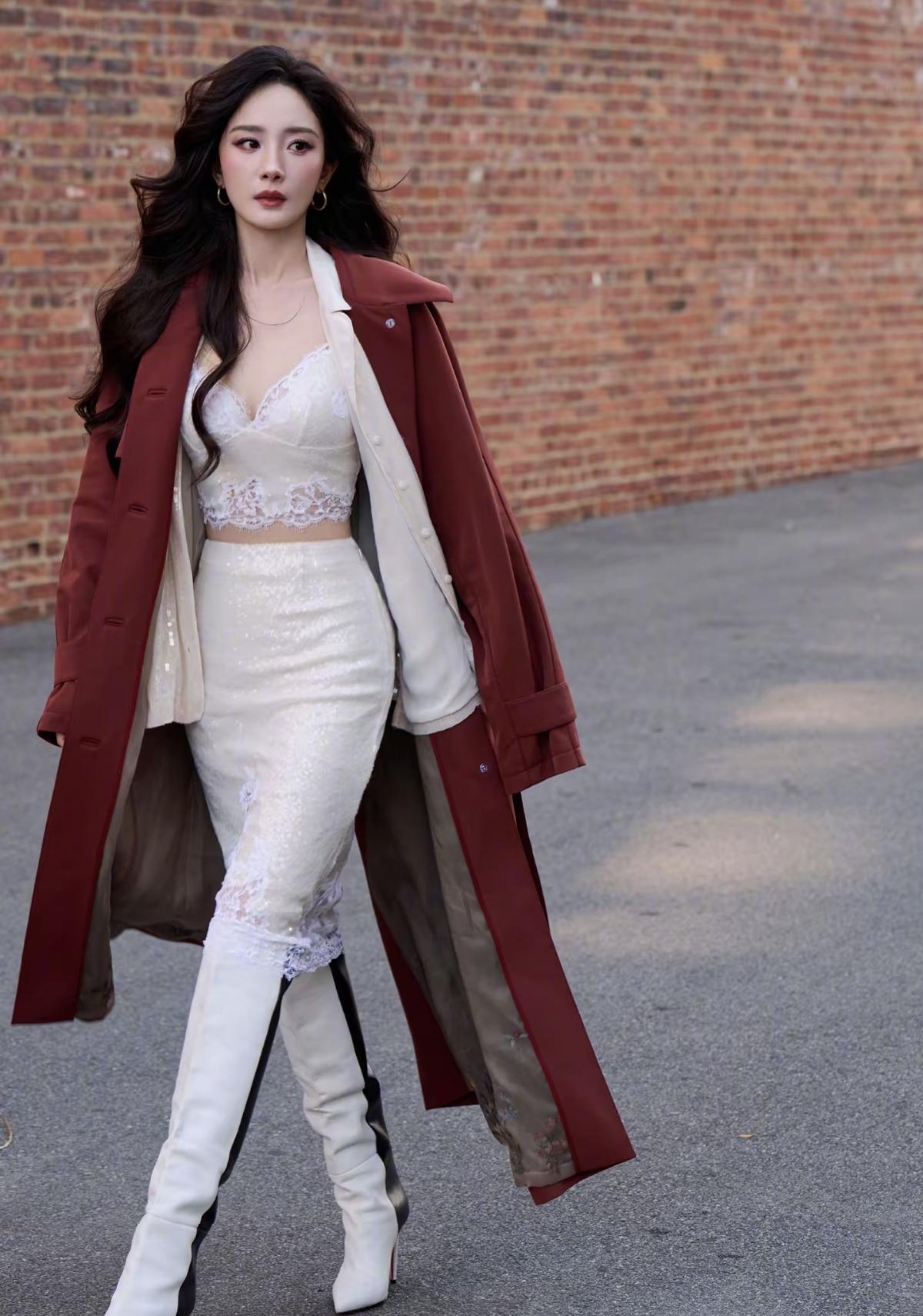 杨幂这套街拍太会了!酒红长风衣气场拉满,内搭蕾丝吊带裙又甜又欲[赞][给力]娱乐明星