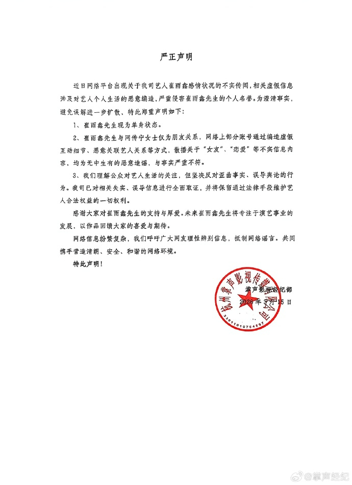 崔雨鑫方否认恋爱崔雨鑫方声明 近日有网友爆料崔雨鑫和女演员宁心存在恋爱关系,引发崔雨鑫 嫂子热议。刚刚,发文称崔雨鑫现为单身,否认恋爱一事,表示已对相关内容取证,保留通过法律手段追责的权利。