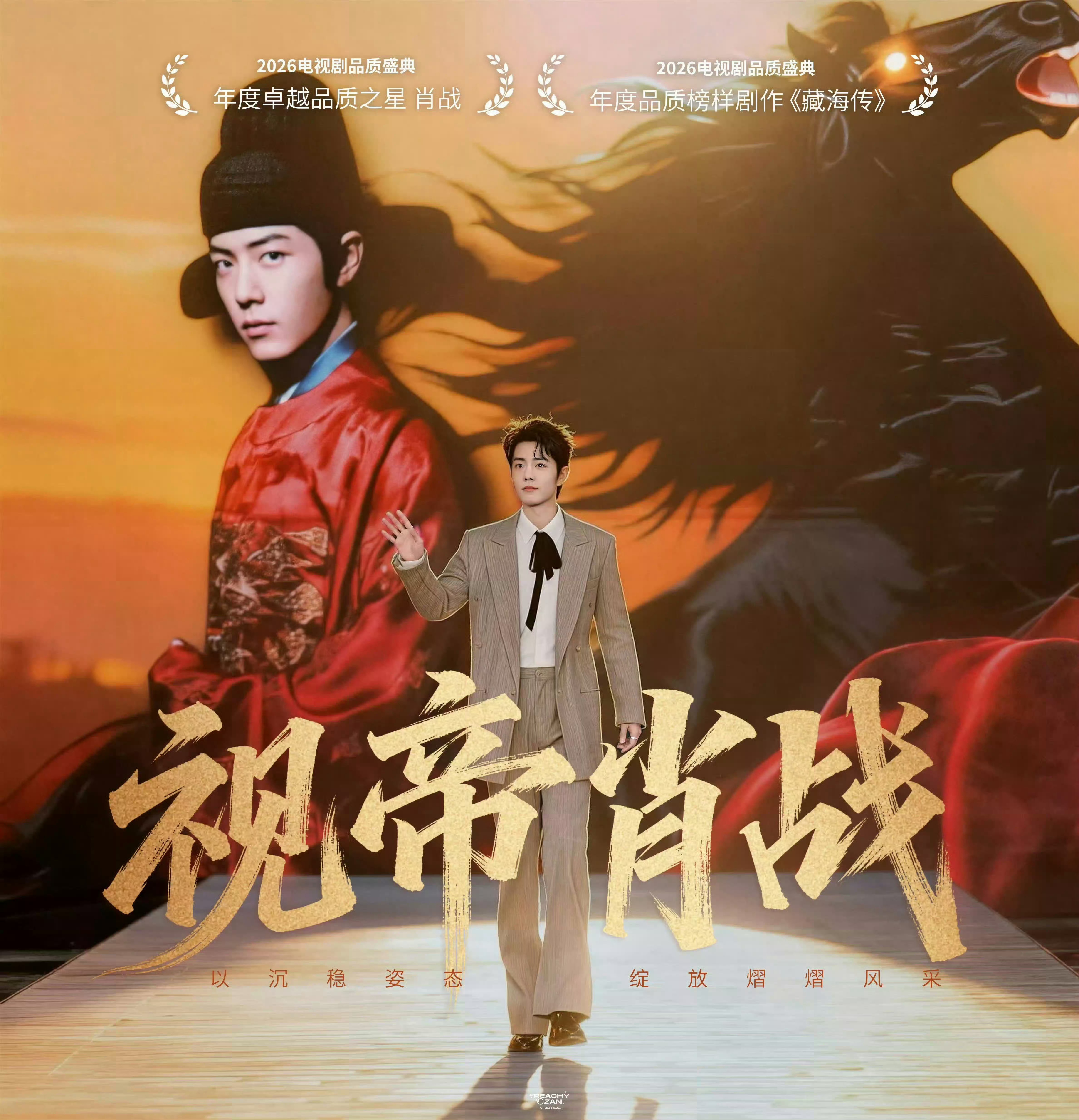 肖战品质盛典红毯画面烈焰燃红毯,战马踏云来。肖战携《藏海传》亮相电视剧品质盛典,从容亮相、气度沉稳,将角色的隐忍与格局,凝于一身自带的气场之中。从角色塑造到红毯呈现,他始终以演员的专业与克制,诠释何为品质与匠心。此次斩获年度卓越品质之星,不仅是对《藏海传》中精彩演绎的认可,更是对其多年深耕演技的肯定。不喧哗、不张扬,以角色立身,以作品说话,凭实力站上属于自己的舞台。这一局,他以初心破局,以实力加冕,荣光自来,未来更可期。肖战品质盛典红毯画面