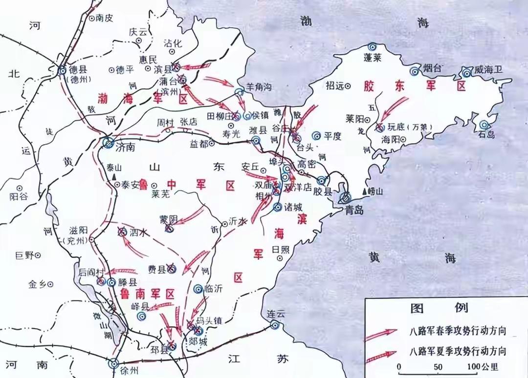 山东抗日根据地 一、初创兴起(1937—1938):遍地烽火,奠定基业 1937年10月日军侵入山东,韩复榘不战而逃,全省迅速沦陷。中共山东省委书记黎玉根据中央指示,领导发动了十大抗日武装起义,其中最具代表性的是徂徕山起义(鲁中)、天福山起义(胶东)、黑铁山起义(清河)等,揭开了山东敌后抗战的序幕。 1938年5月,郭洪涛率干部入鲁,省委扩大为苏鲁豫皖边区省委(12月改为山东分局),郭洪涛任书记。同年12月,八路军山东纵队正式成立,张经武任指挥,黎玉任政委,王建安任副指挥,将山东各地起义武装统一整编,标志着山东地方武装实现了统一指挥。同月,115师第343旅第685团改编的苏鲁豫支队进入湖西地区,开辟了湖西根据地。 二、巩固发展(1939—1940):主力入鲁,政权诞生 1939年3月,罗荣桓、陈光率115师主力挺进山东,首战樊坝、再战梁山,重创日伪军,随后进入鲁南,开辟了抱犊崮山区抗日根据地。罗荣桓在此提出了“插、争、挤、打、统、反”的六字方针,成功在日、伪、顽、友、我各种势力盘根错节中站稳脚跟。 1939年6月,徐向前、朱瑞率八路军第一纵队入鲁,徐向前任司令员,朱瑞任政委,统一指挥山东及苏北八路军。徐向前以擅长建军著称,提出武装“九化”建设方针,半年内将山东纵队从2.5万发展到8.3万人,并开办教导队传授“四大技术”(射击、劈刺、甩手榴弹、土工作业),为部队正规化打下基础。 1940年7月,山东省联合大会在沂南青驼寺召开,成立山东省临时参议会(范明枢任参议长)和山东省战时工作推行委员会(黎玉任首席组长),标志着全省统一的抗日民主政权形成。至年底,建立了鲁西、清河2个行政主任公署、79个县级政权,根据地人口达1200万。 三、艰苦坚持(1941—1943):翻边战术,一元化领导 1941—1942年是山东根据地最艰难的时期。日军推行“治安强化运动”,千人以上“扫荡”达70余次,其中1941年11月调集5万余人合围沂蒙山区,实行“三光”政策。 在战术层面,罗荣桓创造性地提出“翻边战术”——即“敌进我进”,当敌人合围根据地腹地时,主力跳至敌人后方打击其空虚之处。1941年11月的留田突围是经典战例:罗荣桓率2000余机关人员,不费一枪一弹,从5万日军的11路合围中悄然跳出,创造了突围奇迹。1942年至1943年,运用翻边战术相继取得海陵反蚕食、郯城攻坚战等胜利,郯城战役是115师入鲁后的首次攻城战。 1942年8月,山东纵队改称山东军区;1943年3月,115师与山东军区合并,成立新的山东军区,罗荣桓任司令员兼政委、山东分局书记,实现了党政军一元化领导。同时实行主力地方化、精兵简政,开展麻雀战、地道战、地雷战等群众性游击战争。至1943年底,形势全面好转。 四、局部反攻到全面胜利(1944—1945):五路大军,光复齐鲁 1944年起,山东军区连续发起攻势作战。1945年春,葛庄、沂水等战役获胜,各根据地逐步连成一片。 1945年8月,山东省战时行政委员会改为山东省政府,黎玉任主席,这是抗战时期中共唯一成立的省级政府。随后,山东军区组成五路大军大反攻:鲁中王建安、罗舜初部向济南进军;滨海陈士榘、唐亮部向陇海线及青岛进军;胶东许世友、林浩部向青岛及胶东半岛进军;渤海杨国夫、景晓村部向津浦线及济南进军;鲁南张光中、王麓水部向徐州进军。至9月底,解放除济南、青岛等少数城市外的山东大部,歼灭日伪军6万余人。 历史地位 抗战胜利时,山东解放区面积12.5万平方公里,人口2800万,八路军主力27万人、民兵50万人,成为全国最重要的战略根据地。山东军民共作战2.6万余次,歼敌50余万,为进军东北、解放全国作出了不可磨灭的贡献。