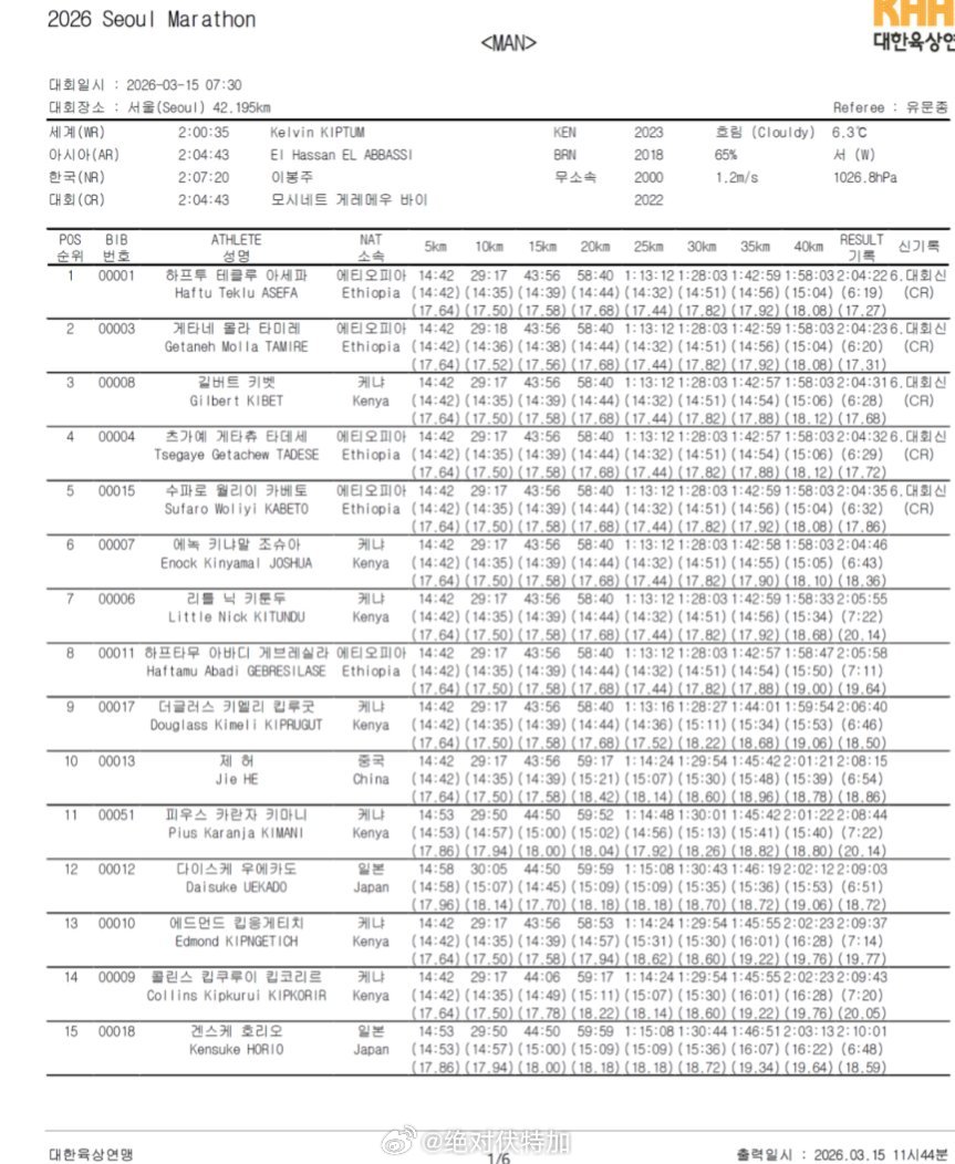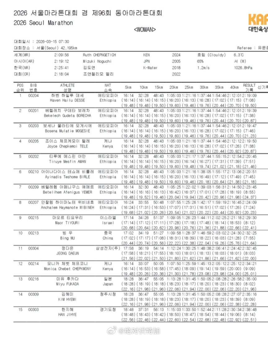 2026首尔马拉松成绩单。中国何杰2:08:15男子第10名;女子吴冰2:32:25女子第10名。苏飞2:10:07取得PB。日本上门大祐、深田望友分获男女第12名,堀尾谦介第15名。