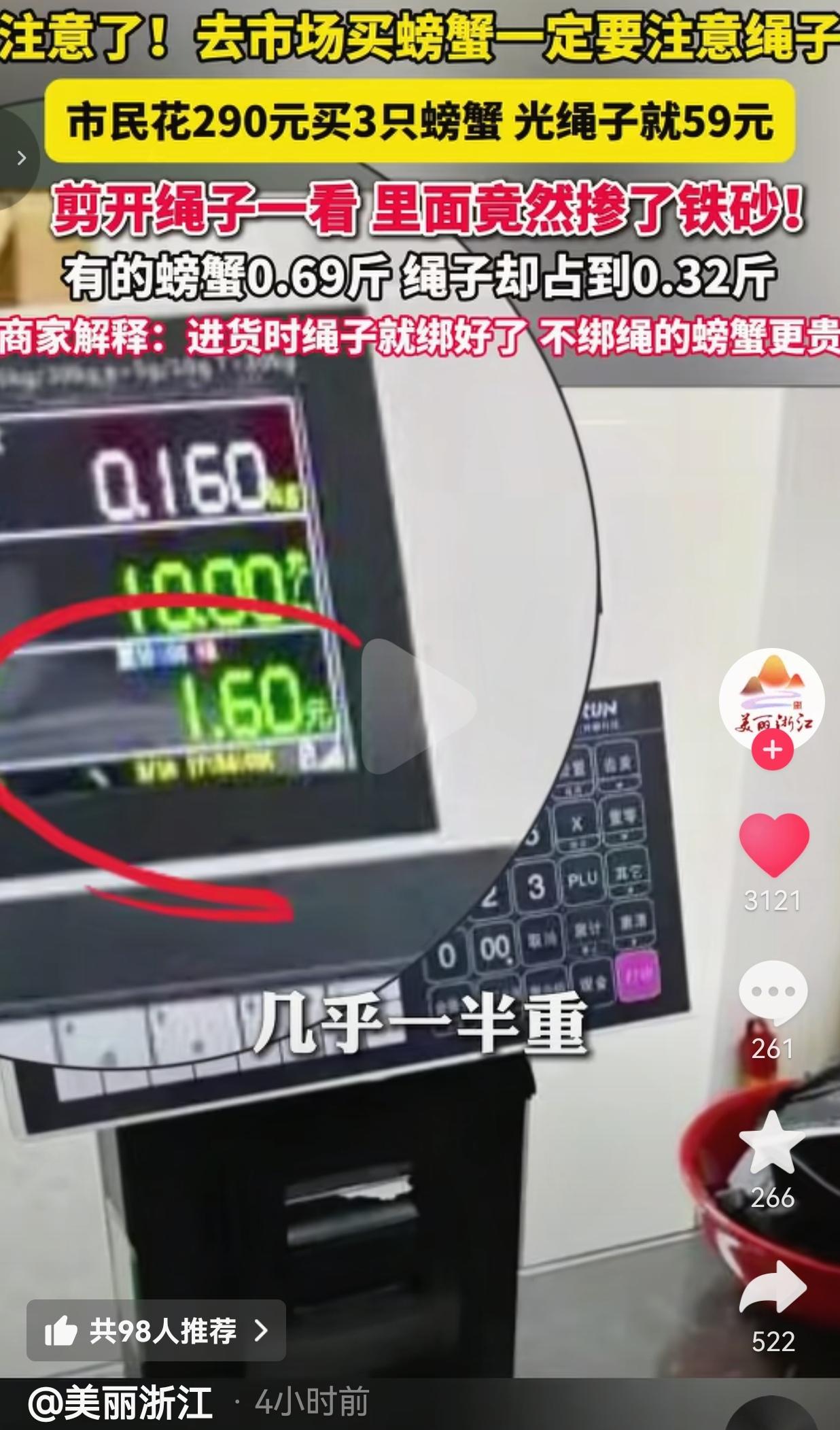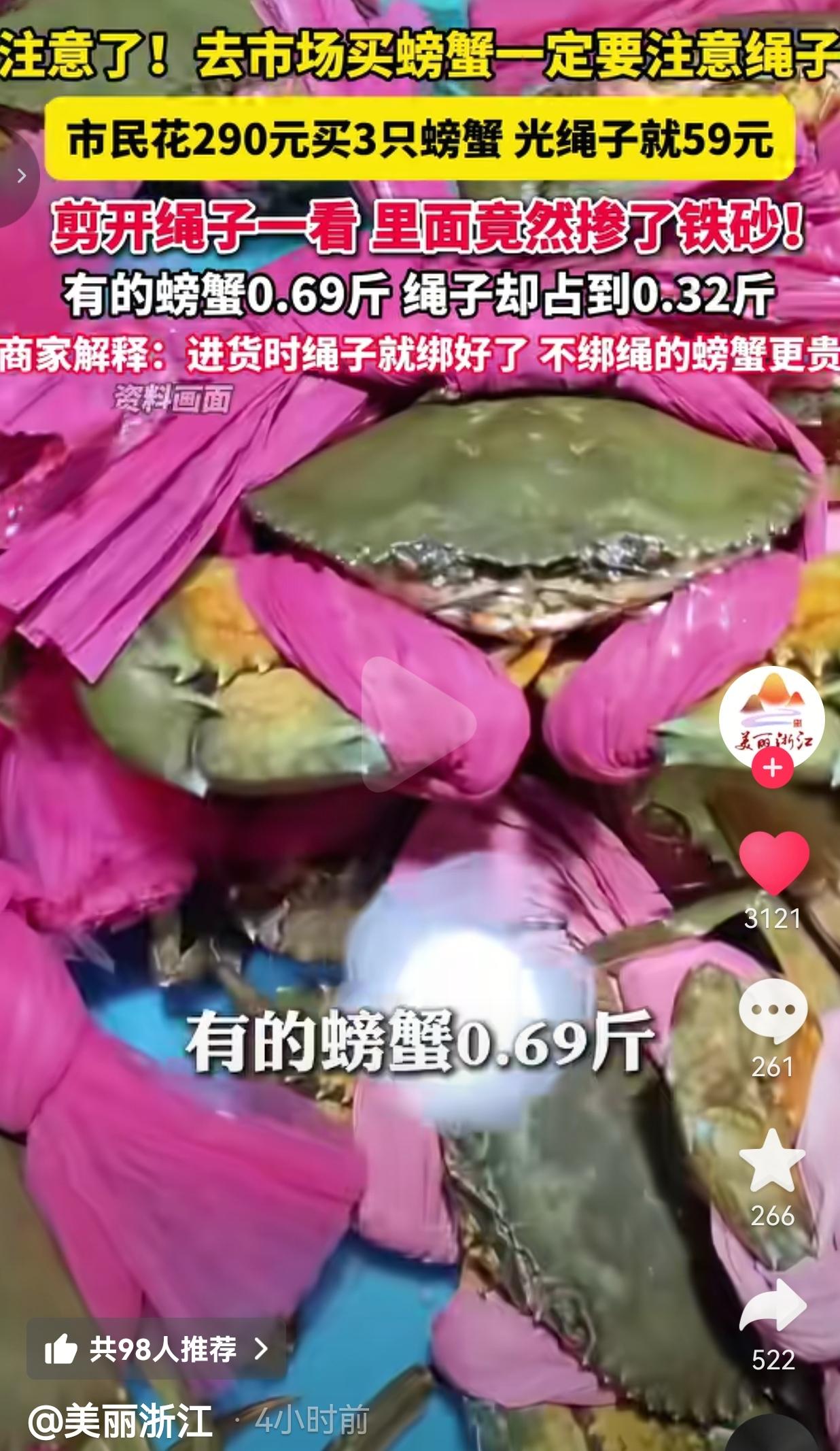 这也太离谱了!290块买3只螃蟹,结果绳子占59块!剪开一看全是铁砂,商家还说“这是潜规则”? 福州的黄女士花了290块买了3只螃蟹,回家一称,光绑蟹的红绳子就重0.32斤,一只0.69斤的蟹,绳子快占了一半! 她越想越不对劲,拿剪刀剪开绳子一看——里面密密麻麻全是小黑点,拿吸铁石一吸,全是铁砂! 合着她花大价钱买的不是蟹,是裹在铁砂里的绳子! 更气人的是,商家不仅嘴硬:“进货时绳子就绑好了,不绑绳的螃蟹更贵!” 记者去市场一查,这根本不是个例!好多摊位的蟹都绑着这种沉得离谱的绳子,有的甚至比这还过分,把铁砂掺进绳子里增重,就是为了多赚黑心钱! 好在目前福州市场监管部门已经介入调查,就等着看这些黑心商家怎么收场! 网友看到后评论说:“290块里59块是绳子钱,这利润比贩毒还高!以后买蟹是不是得自带剪刀,现场剪绳称重。 也有的网友说:“早就知道这猫腻!以前买青蟹,绳子泡得湿哒哒的,现在直接掺铁砂,真是越来越没底线了!” 还有的网友说:“315晚会怎么不曝光这种事?明星偷税漏税上热搜,老百姓买个蟹被坑成这样,现在才有人管?” 要我说,卖海鲜的,靠的就是诚信,结果你倒好,把铁砂塞进绳子里,把老百姓的血汗钱当韭菜割! 一句“进货就绑好”就想撇清责任?那我买了你的蟹,是不是还要替上游商家背锅? 一句“这是潜规则”就想合理化诈骗?那是不是以后卖菜掺沙子、卖肉注水,都能叫“潜规则”?这不是缺斤少两,这是明晃晃的诈骗! 你想想,黄女士本来想给家人做顿好的,结果拆开一看全是铁砂,那种失望、愤怒、无助,谁能受得了? 我们普通人赚点钱容易吗?买个菜都要精打细算,结果被这些黑心商家当冤大头耍! 更可笑的是,这种事根本不是第一次发生!以前是泡湿绳子增重,现在是掺铁砂,手段越来越隐蔽,越来越恶毒! 以前没人管,就成了“潜规则”;现在闹大了,监管才介入调查? 难道非要等老百姓忍无可忍、把事闹上热搜,才有人出来管一管? 我们要的不是一句“会调查”,是实实在在的处罚,是让这些黑心商家再也不敢坑人,是让这种吃人的“潜规则”彻底消失! 别跟我说“不绑绳的螃蟹更贵”,贵我愿意买,我买的是蟹,不是你这裹着铁砂的破绳子!别用这种鬼话来糊弄老百姓,我们不傻,我们只是不想跟你扯皮,但这不代表我们可以任人宰割! 别再拿“潜规则”当遮羞布,这就是赤裸裸的欺诈,是对消费者权益的践踏! 对此,你怎么看?