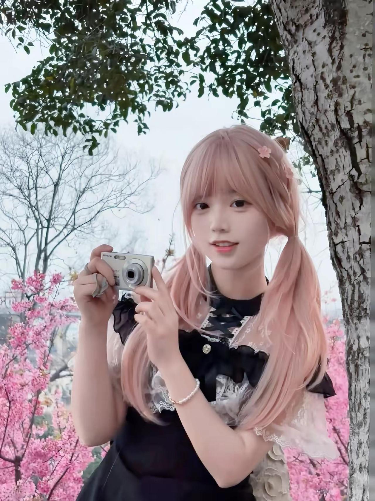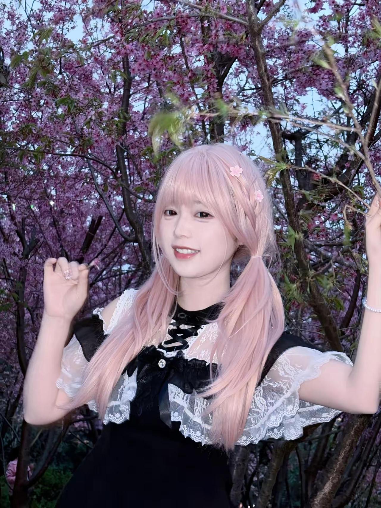 樱花树下长满了人 若爱 樱花季甜妹穿搭 樱花粉发