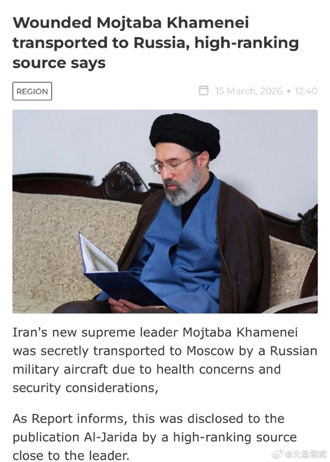 据《Al Jarida》报道,伊朗新任最高领袖莫吉塔巴·哈梅内伊被秘密送往莫斯科。