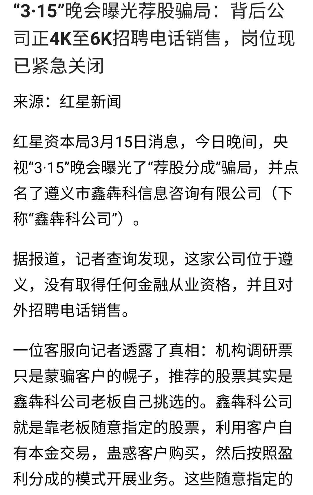 3·15曝光名单来了,按利空程度从高到低排序: 最高利空(直接点名+核心业务/品牌重创) 1. 浪莎股份(600137) 一次性内裤代工厂未灭菌、材质造假、伪造检测报告,品牌信誉直接崩塌,产品召回/处罚风险高 。 2. 多氟多(002407) 子公司违规售工业双氧水用于食品加工,涉食品安全+危化品违规,监管处罚与供应链风险双压 。 3. 周大生(002867)、老凤祥(600612)、周六福(06168.HK) 一口价黄金缺斤短两、纯度造假、隐瞒克重,全行业信任危机,终端销售短期承压 。 4. 贝瑞基因(000710) 关联公司外泌体虚假宣传,医疗合规+商誉受损,业务拓展受阻。 中高利空(间接关联+业务受冲击) 1. 58同城(600588) 旗下啄木鸟维修被曝小病大修、天价收费,平台口碑与流量受损。 2. 国联水产(300094)、安井食品(603639) 受“泡药虾仁、预制菜冒充现炒”舆情冲击,食品板块情绪走弱。 持有这些公司的一定要及时处理好手上票啊,以免造成更大损失。 所以咱们选公司的时候一定要擦亮眼睛好好瞧瞧。今年晚会聚焦“放心消费品质生活”,曝光了不少行业乱象。像网红鸡爪生产车间脏得令人作呕,网红神药外泌体是三无产品,增高机构搞骗局疯狂敛财,私域营销5倍暴利围猎老人等。 要是持有被曝光公司的股票,那可得赶紧处理。过去也有不少企业被3·15曝光,有的连夜道歉、紧急下架产品。比如曾经的“土坑酸菜”全面整改,骚扰电话产业链也被集中整治。但也有些问题没彻底消失。所以,看到名单里有自己持有的公司,千万别犹豫,及时处理,别让自己亏大了。 你持有的公司有没有在曝光名单里呢?