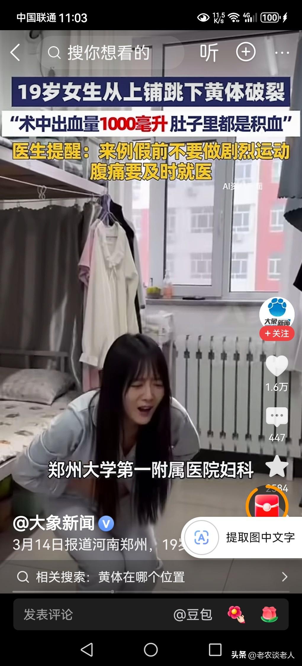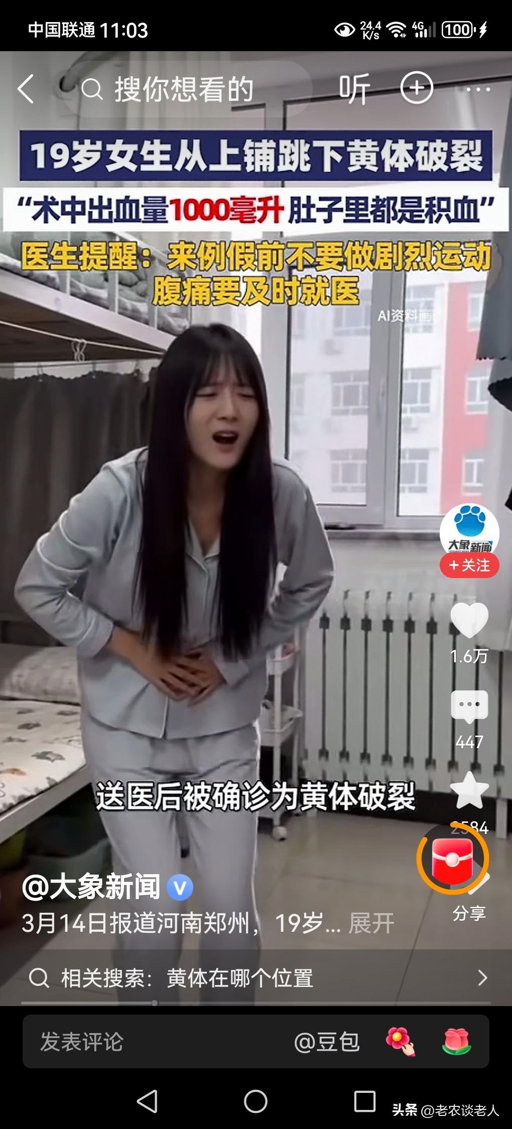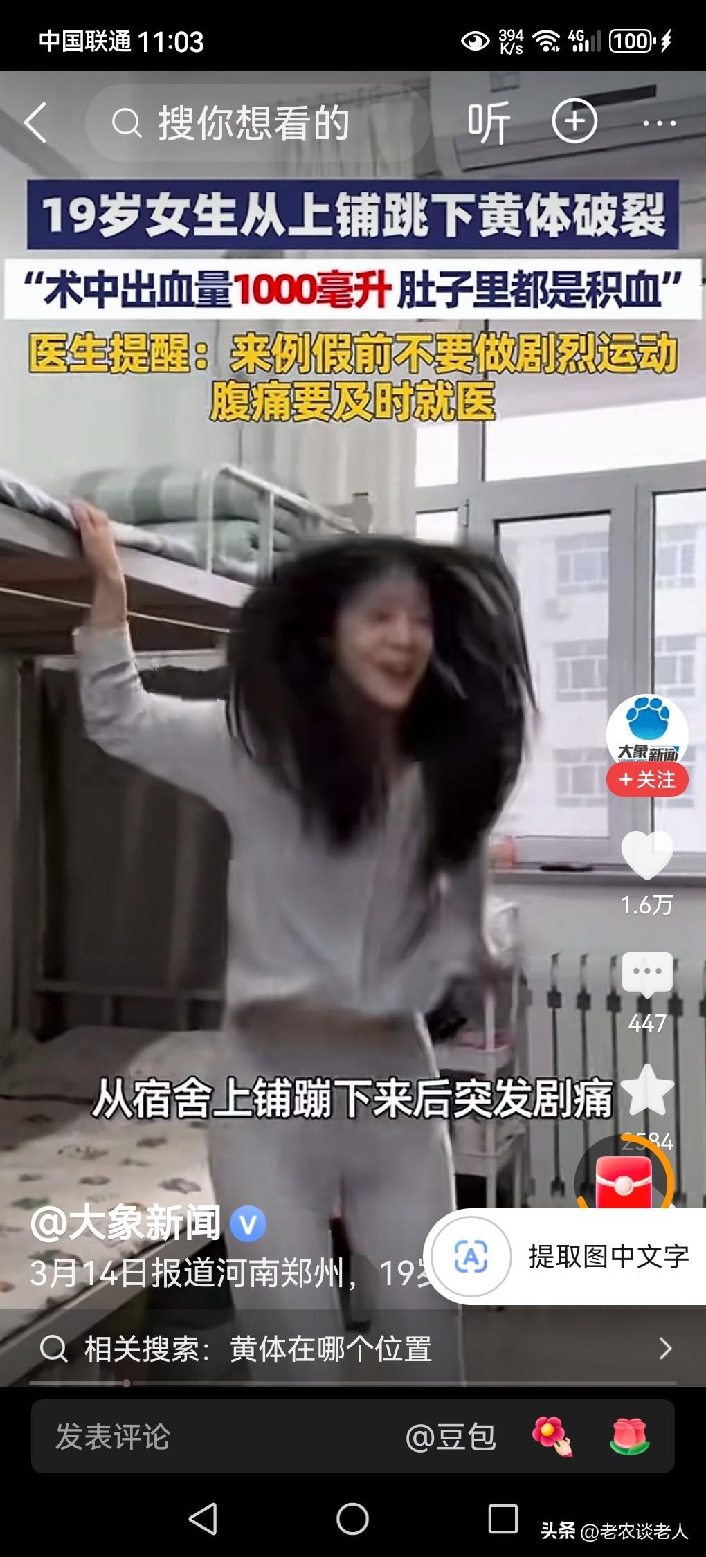 19岁女生从上铺跳下致黄体破裂。 我在幼小的时候,父母和长辈都教育我,在玩耍的时候,千万不要随意从高处向低处蹦跳,是非常危险的事情,稍有不注意就会造成身体内面器官的损伤。 据媒体3月16日报道,19岁女生在学校宿舍里,从上铺蹦跳下来,由于蹦跳过程中用力过猛,造成身体内面导致黄体破裂,肚子里面有积血,盆腔里面充血1000毫升。医生警告,女生在来“例假”的时候,要禁止剧烈运动,出现腹部疼痛,要立即就医,避免月经期出血过多。 家里有孩子的父母,特别是有女孩子的家庭,一定要对子女进行身体健康和身体安全教育,在月经来临的时期,千万要注意,不要剧烈运动,避免月经期出血过多,危害身体健康。一旦身体出现疼痛现象的时候,就要立即去医院看医生,避免出现不可预测到伤害发生。