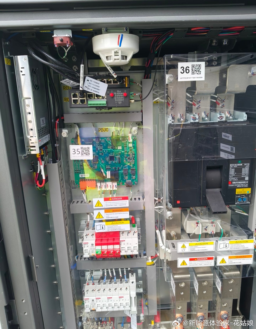 1. 功率与电气架构大电流母线设计:图中粗壮的红/蓝/黄/绿多色电缆是三相交流输入+直流输出的核心母线,线径远超普通快充桩,能承载最高1500kW级瞬时功率。模块化功率单元:下半部分橙色电缆连接的堆叠模块是DC/DC功率模块组,采用N+1冗余设计,单模块故障不影响整体输出,同时方便后期扩容升级。直流输出端子:第四张图的四根红色粗线标注了 DC+ / DC- ,是直接给车辆高压电池充电的接口,绝缘防护等级达到IP54,适配户外复杂环境。2. 控制与智能系统核心控制板:第三张图的绿色PCB板是主控单元,负责功率调度、通信协议(CCS/GB/T)、故障诊断和数据上传,支持车-桩-云实时联动。智能配电模块:上方的断路器、浪涌保护器和计量表组成三级配电保护,能在过流、过压、雷击时毫秒级切断电源,保障设备和车辆安全。通信接口:网口、RS485接口支持与电网、车企平台对接,实现V2G(车网互动)和动态功率分配,削峰填谷降低用电成本。3. 安全与防护设计多级防护:从图中可见 DANGER / WARNING 警示标签、透明绝缘隔板、烟雾探测器(第三张图白色装置),构成电气隔离+防火预警+物理防护三重安全屏障。接地与EMC:黄绿双色接地线和金属柜体接地设计,有效抑制电磁干扰,避免对车辆电子系统造成影响。防水防尘:柜体采用密封结构和底部胶封处理,满足户外IP54防护等级,适应高温、多雨、多尘环境。4. 战略意义这套闪充桩是比亚迪补能生态先行的核心载体:对内:刺激国内市场需求,解决用户续航焦虑,推动高端车型销量。对外:作为技术输出标杆,在欧洲、巴西等市场布局超充网络,形成“车+桩+云”一体化竞争力。👉 你觉得闪充能彻底解决续航焦虑吗?比亚迪大v聊车新能源大牛说