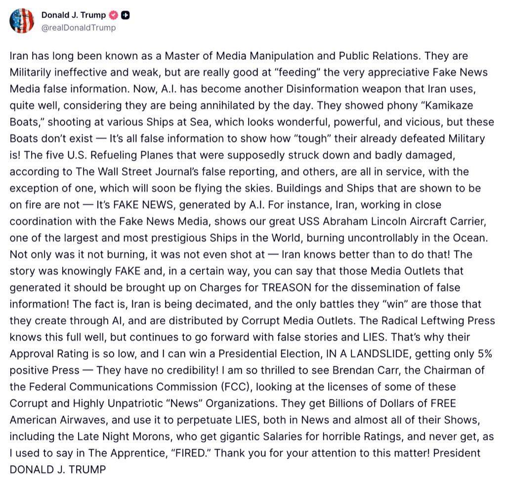 大统领越来越失控了......... 特朗普气急败坏说:“看到联邦通信委员会主席布伦丹·卡尔审视这些腐败且极度不爱国新闻组织的许可证时,我感到非常振奋。”