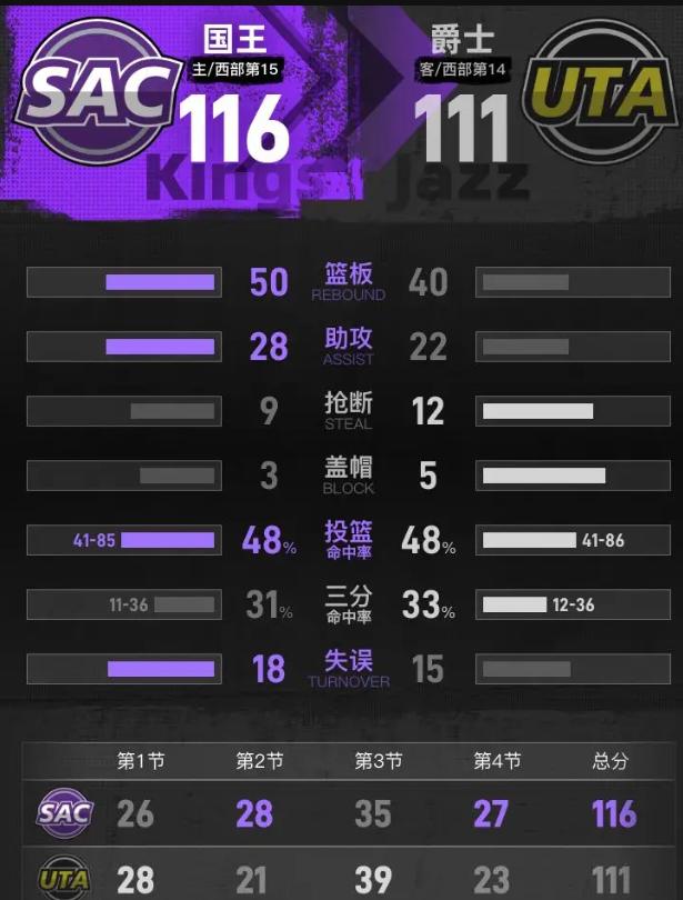 2026年了,NBA都快被三分淹没了,怎么还有人能用中距离活生生把比赛嚼碎? 这就是德罗赞。36岁,41分11助攻,没有爆炸弹跳,没有超远三分,就凭腰位背打、转身、中投,把爵士那帮"天赋怪"打到没脾气。科迪·威廉姆斯34分7板7助,森萨博22分,数据够炸吧?第四节最后五分钟,球在谁手里谁心里就有底——德罗赞连拿关键分,爵士年轻人眼里只有篮筐和慌乱。 你说这是代沟?不,这是硬解能力的鸿沟。爵士这帮小伙子能跑能跳,科利尔21分5板冲劲十足,但比赛陷入泥沼需要一个个凿的时候,德罗赞一个转身就能创造出手机会,爵士侧翼们却只能看着球发呆或者硬冲被盖。阿丘瓦20分11板、海耶斯16分8助是打得不错,但国王今天赢就赢在:关键时刻球该给谁,那个人真能搞定。 爵士三连败不是意外,是"只开花不结果"的必然。天赋堆砌不等于赢球基因,降节奏打阵地时没人能稳定取分,防守沟通一团糟,眼看着36岁老头用古典技艺收掉比赛。这种"差点翻了"又"突然崩了"的剧情,爵士球迷这赛季看得还不够多吗? 德罗赞给所有迷信天赋的人上了一课:基本功和阅读比赛的能力,永远不会过时。 爵士想真正赢球,得先学会怎么在关键时刻不慌乱。这场比赛,国王赢在老炮儿的底气,爵士输在年轻气盛却少了颗定盘星。成长要交学费,但这学费交的频次,该降降了。德罗赞41+11威廉姆斯空砍34分 国王险胜爵士