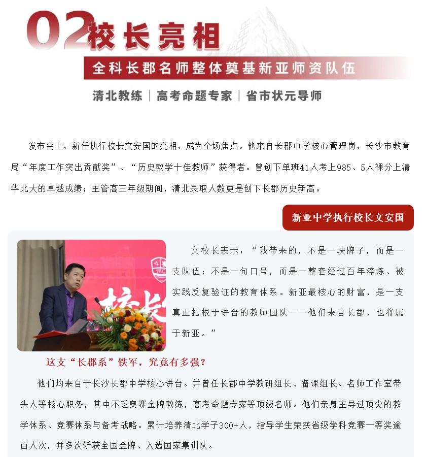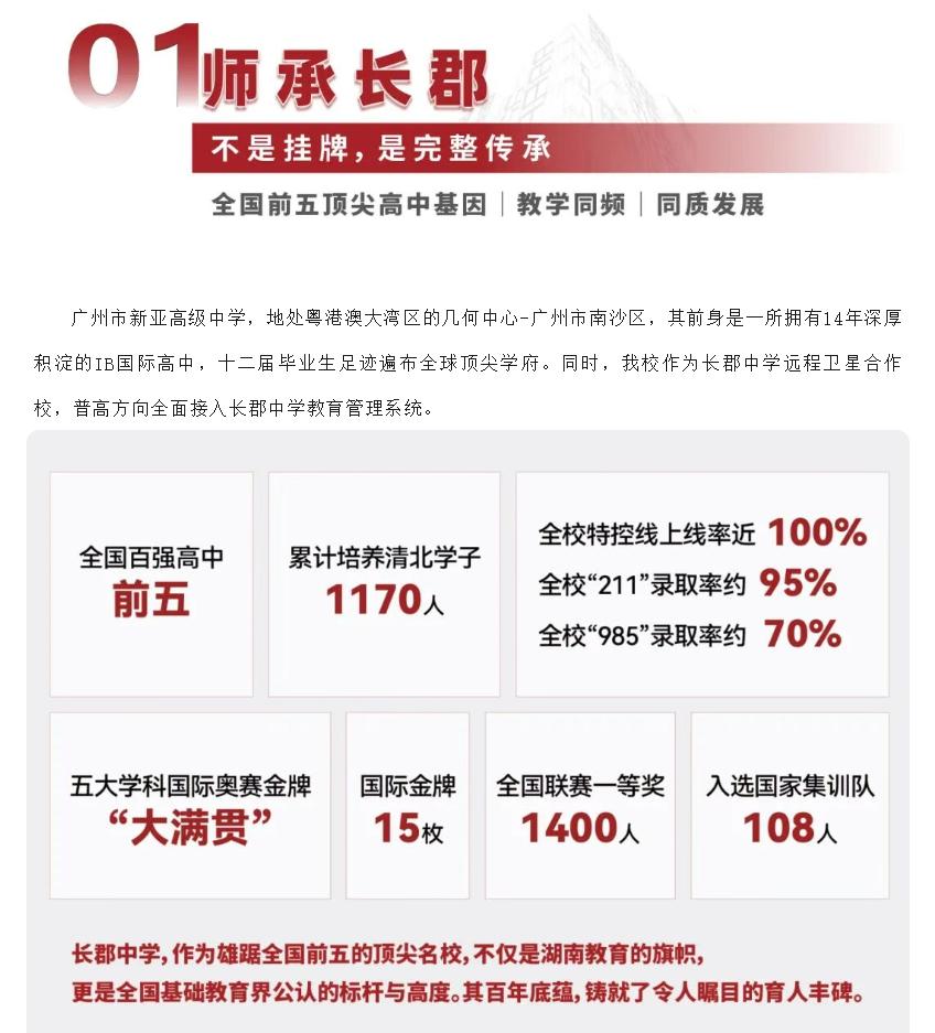 【南沙这所民办高中今年有大变动!长沙长郡中学加持】位于南沙慧谷西区的广州市新亚高级中学迎来了办学的第二年。今年学校举行2026年战略升级发布会,宣布学校将迎来全新的变动。 校方在会上宣布已经和北京步学教育集团与广州威学一百国际教育集团正式达成合作,共同投资并主导该校的未来发展。校方表示,新亚高级中学将在课程建设、师资力量及升学服务等方面迎来新一轮提升。2026年起,学校将全面运行新的教学和管理体系。 另外学校也迎来新任执行校长文安国,文安国此前在长沙长郡中学担任管理职务,曾获长沙市教育系统多项荣誉。据介绍,他将带领一支曾在长郡中学任职的教师团队进入新亚高中,承担一线教学任务,该团队中包括多名教研组长、竞赛教练及有高考命题经验的教师。 作为长郡中学远程卫星合作校,该校在普高方向将全面接入长郡中学教育管理系统。该校将通过“同教研、同备课、同考试、同评价”的常态化联动机制,实现与长郡本部的教学同步。 在教学安排方面,新亚高中计划采用小班化教学,每班36人。 校方还宣布新亚高中今年首次开设公费班并开展招生。更加惊喜的是在办学质量全面提升的情况下,学校今年的学费也有所下调,亲民价仅需22000元/学期,比上一年的31800元/学期下降不少。 其中家长最关心的莫过于有长沙长郡的加持了。长沙市长郡中学是湖南省示范性普通高级中学,创建于1904年。学校教育教学各项评价指标在全国名列前茅,该校高中数学、物理、化学、生物、信息学五科奥赛有1400余人次获得全国联赛一等奖,143名学生入选国家集训队,近十年来入选国家集训队人数位居全省第一。 另外北京步学和广州威学一百两家也不容小觑。