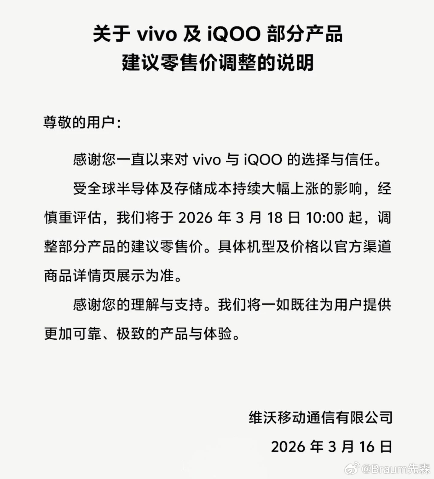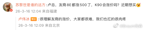 OV等多数手机厂商都陆续发公告涨价的情况下,卢伟冰的意思是K90要硬抗成本压力,不涨价。这样K90的大内存版本对比下来优势很大,因成本上涨导致同类型产品压在3K内的512GB版本基本没有,以后高性价的骁龙8E大概很少见了。卢伟冰回应友商涨价