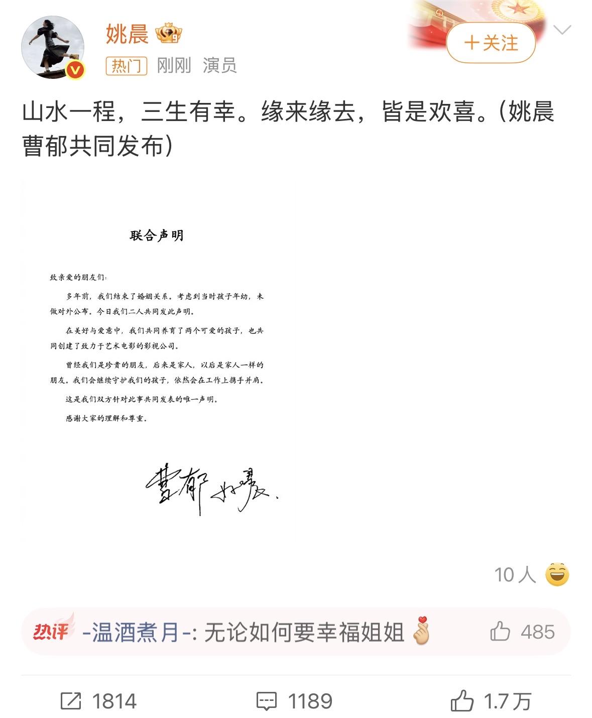 姚晨又离婚了??而且是离婚好多年了!! 真是不可思议,这已经是姚晨第二次离婚了,第一次是2011年与凌潇肃,离婚前后撕得轰轰烈烈,还以为与曹郁始于2012年的这段婚姻能够白头到老。 据悉,姚晨与曹郁有一儿(小土豆)一女(小茉莉),分别出生于2013年及2016年。而离婚多年未公开的原因,姚晨表示,当时孩子尚且年幼。