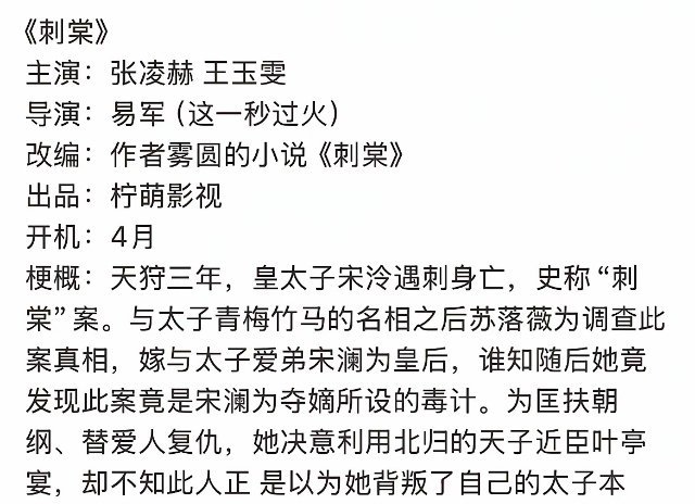 3月14日,张凌赫《逐玉》播出后的首部剧,二搭王玉雯,合作古装剧《刺棠》,下月开