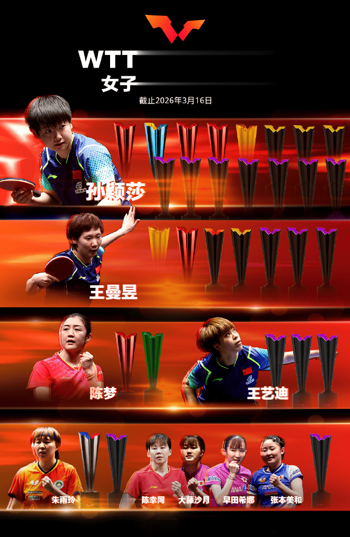 女单方面,张本美和收获个人WTT生涯首冠上榜;孙颖莎共斩获15冠遥遥领先。