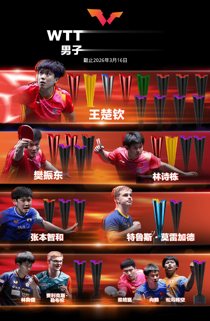 赛后,WTT官方更新了最新一期的1000+赛事球员冠军榜:男单方面,菲利克斯-勒布伦获得个人第二冠,排名上升一位与林昀儒并列第6;王楚钦仍以12冠高举榜首。