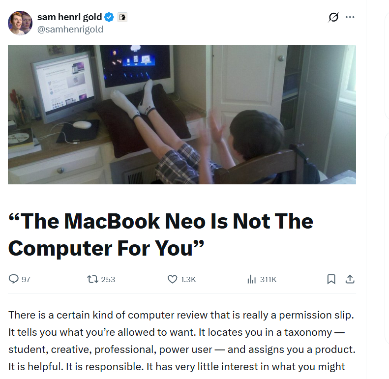 立马就让人联想到了最近苹果新发的入门级笔记本Apple Neo,这个产品用的是手机芯片,内存只有8GB,不过售价也只有599美元。但是外媒一个小伙子Sam Henri Gold写了一篇文章“The MacBook Neo Is Not The Computer For You”。