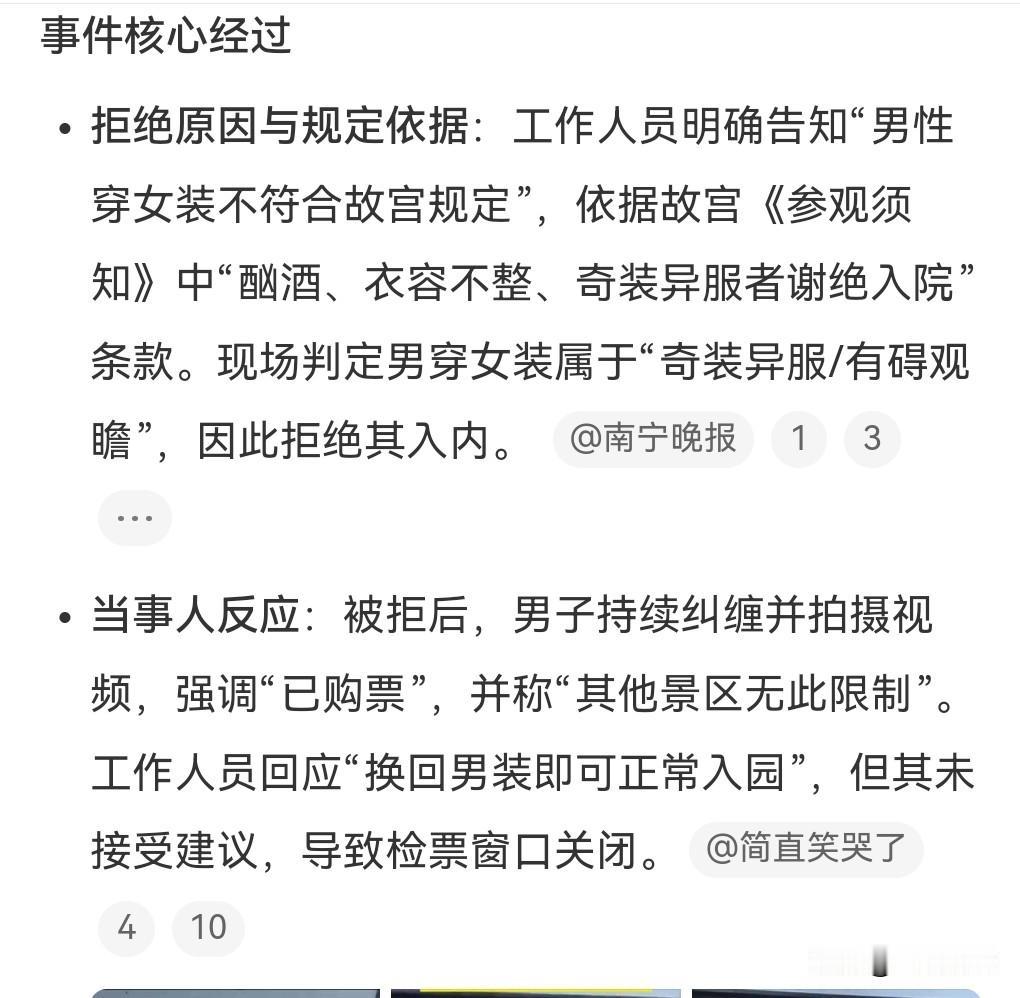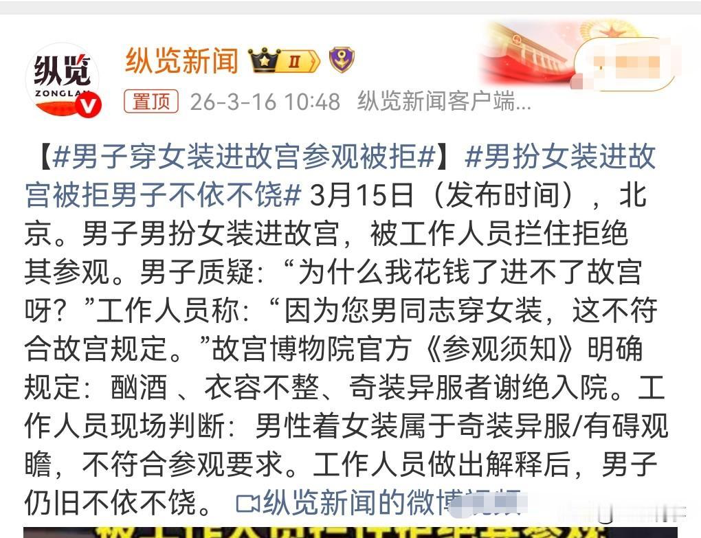 男子穿女装那可能是有一些特别的爱好。3月15日(报道),男子穿女装进故宫参观被拒。虽然穿衣自由,但是也得分场合,故宫好歹也是一个严肃的景点。 男子说我花钱了,为什么进不了故宫啊?工作人员称,因为你是男同志穿女装不符合故宫的规定。 规定称奇装异服不得入内。男人穿女装,那肯定属于奇装异服了。但是男子不服,在那里无理取闹。工作人员要他换男装后再进去,他也不换。他还发视频吐槽这个事情。结果很多人都在批评他,他也只好删除了视频。 这就是属于所谓的网暴自己吧,有些人明明是自己做的不对还反而认为是对方的错,发视频到网上结果自身遭到批评。 吃一堑长一智,希望这名男子还是去逛一下故宫,不过下次一定要记得穿男装去。毕竟能去一次故宫也是可以的。