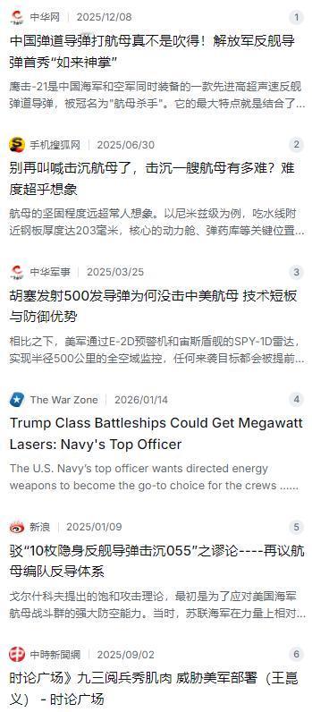要是真的开打,中国导弹能干掉美国航母吗?答案是,基本没戏。就算鹰击-21这样的猛家伙真打中了航母,想一发就让它沉海,那也是做不到的…… 麻烦看官老爷们右上角点击一下“关注”,既方便您进行讨论和分享,又能给您带来不一样的参与感,感谢您的支持! 咱们得实事求是的聊一个军迷圈的热门话题:要是真到了剑拔弩张那一天,咱们的“航母杀手”,比如那个大名鼎鼎的鹰击-21,一发过去真能把美国航母送进海底吗? 答案可能会让很多热血沸腾的朋友失望——基本没戏。不是说咱们的导弹不厉害,而是对面的目标,实在是太硬了。 首先,咱得正视美国航母的“血条”有多厚。那玩意儿可不是普通的大船,简直就是一座移动的钢铁堡垒。以尼米兹级为例,光吃水线附近的钢板就有20多厘米厚,关键的弹药库和动力舱,更是披着半米多厚的复合装甲 。 更绝的是它肚子里那套设计,两千多个水密隔舱把船分成无数个小格子,就算被撕开几个大口子,只要把相应的舱门一关,海水就被困在那一小块地方,根本漫延不到全舰 。 美军自己2005年就拿退役的“小鹰号”做过试验,各种导弹鱼雷轮番上阵炸了25天,这艘8万吨的巨舰愣是倔强地浮在水面上,最后是人家自己在内部埋了炸药才把它送下去 。咱们的鹰击-21即便灌顶攻击威力巨大,但单靠一发就想让这种庞然大物彻底丧失战斗力和动沉没,确实不太现实。 想碰到航母的边儿,本身就是一道地狱难度的关卡。美国航母从来不是孤家寡人,身边总跟着一帮“带刀侍卫”。它们组成了外、中、内三层密不透风的防御圈。 最外围,有E-2D预警机在天上盯着,五六百公里外就能发现来袭目标,随即就能派出F/A-18或者F-35C前出拦截,让你的载机平台根本没机会进入发射阵位 。就算导弹射出来了,中间还有一排排的宙斯盾舰等着,它们携带的标准系列防空导弹,能同时应付几十个目标,这构成了第二道密集的拦截网 。 即便有漏网之鱼冲到了最后几十公里,航母自身和护航舰艇上的“海拉姆”、“海麻雀”以及“密集阵”近防炮也会打出最后的弹幕 。这套体系号称能拦截掉95%以上的来袭目标,想撕开这道口子,难度可想而知。 咱们的高超音速导弹比如鹰击-21,确实是个狠角色。它打得太快,末端能达到10马赫,而且飞得又高又刁钻,搞灌顶攻击,这确实大大压缩了美军的反应时间,让它传统的拦截手段有点抓瞎 。以前都说它是“航母杀手”,也正是看中了这一点。但话又说回来,道高一尺魔高一丈,美军现在也在憋大招。 他们正拼命研发舰载激光武器和高能微波武器,就想对付高超音速武器这种新兴威胁。美国海军作战部长已经放话了,未来的“特朗普”级战舰要装上兆瓦级的激光武器,这玩意儿理论上能以光速烧穿来袭导弹的壳体,而且弹药成本几乎为零 。虽然现在技术还不完全成熟,受天气和距离影响大,但这个方向已经很明确了,就是要把未来的导弹威胁扼杀在摇篮里。 所以,现在的共识是,别指望一发入魂。真要干,就必须来狠的。咱们得组织起从潜艇、水面舰艇、轰炸机上发射的多方向、多批次饱和攻击 。 上百枚导弹同时扑过去,先打掉它的预警机和外围护航的宙斯盾舰,把这个防御网撕开一个口子,然后后续的导弹再精准补刀,命中航母的升降机、舰岛、动力舱这些要害,才有可能让它彻底瘫痪 。这种打法,考验的已经不仅仅是导弹本身,更是整个侦察、通信、指挥体系的协同作战能力。 说到底,美国航母的生存能力,是它整个工业设计和作战体系的集大成者。咱们讨论能不能击沉它,本质上是在探讨如何破解一个由舰船设计、编队协同、电子对抗构成的复杂系统。 那个所谓“不可击沉”的神话,只有通过更庞大的体系化打击力量才能去打破。它不是一两件新式武器就能轻易颠覆的,而是两个大国综合实力和军事智慧的全面碰撞。