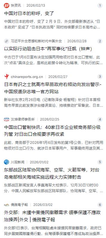中国对日本的称呼,变了,以前我们一直称作“日本政府”,如今我们对日本的叫法变了,然而别小看了这次叫法的不同,称呼变了很可能就意味着,中日对峙的局面也将发生改变。 麻烦看官老爷们右上角点击一下“关注”,既方便您进行讨论和分享,又能给您带来不一样的参与感,感谢您的支持! 最近不知道大伙留没留意一个细节,咱们中国在提到日本的时候,叫法上出现了一个挺微妙的变化。以前外交部的表述里,清一色都是“日本政府”,比如“中方对日本政府的行为表示关切”。但现在,这个称呼悄悄地变成了“日本执政当局” 。您可别觉得这只是咬文嚼字,在外交这个行当里,称呼的变动往往代表着对双边关系定位的重新校准,背后藏着大文章。 以前喊“日本政府”,那是在讲一种政治上的认定,是对当前内阁的一种背书,暗示着咱们愿意跟对方打交道、共同承担彼此关系的预期。现在换成“执政当局”,这距离感一下子就拉开了。这等于是在告诉外界:我们针对的不是日本这个国家,更不是日本老百姓,而是以现在首相为首的那一拨做决策的人 。之所以要特意划清这条线,实在是因为日本那边的动作太出格了,特别是在高市早苗上台之后。 自从高市早苗执掌政权以来,日本在历史认知和台湾问题上的调门就越来越高,简直是在钢丝上跳舞。去年11月,她甚至在国会公开叫嚣,说什么“台湾有事可能构成日本存亡危机事态”,暗示日本自卫队可以武力介入台海 。这话有多重,大伙心里都清楚,台湾是中国领土不可分割的一部分,这哪是什么外交摩擦,这分明是粗暴干涉中国内政,触碰了咱们最核心的红线。再加上日本右翼势力最近这几年疯狂扩军,防卫费连续十几年上涨,三年就翻了一番,还整天喊着要修改和平宪法,这能不让人警惕吗? 。 既然对方把咱们当成了“战略挑战”,那咱们这边的措辞和手段自然也得跟上节奏。这次改叫“执政当局”,就是在国际舆论场上把矛头精准指向岸田或者高市内阁的具体政策,指向那些搞价值观对抗的政客。这既是一种警告,也是一种剥离——别把账算到两国人民头上,中日关系搞成这样,责任就在你们这帮右翼势力 。当然,光在嘴皮子上划清界限还不够,如果对方听不懂“好话”,那咱们手里也备着“硬菜”,得让他们知道疼。 就在上个月,中国商务部一口气甩出了两份重量级公告,把40家日本实体列入了出口管制的名单 。这可不是象征性的抗议,而是实打实的精准打击。其中20家性质最严重的,直接被拉进了“管控名单”,比如三菱重工、川崎重工这些日本军工的顶梁柱,咱们彻底禁止向它们出口任何两用物项,正在进行的交易也得立马叫停 。还有另外20家被列入“关注名单”的,虽然没完全禁运,但以后想从中国买东西,审查严得能扒层皮。 这一招打下去,日本军工企业估计得倒吸一口凉气。别看它们平时造的军舰、战机挺唬人,其实很多核心材料和关键零部件都高度依赖从中国进口。比如日本最先进的潜艇、宙斯盾舰上用的高性能稀土永磁体和雷达组件,离开了中国的供应链,不说立刻趴窝,至少也得大伤元气 。有日本经济学家算过账,要是相关管制持续一年,日本GDP可能得蒸发掉几千亿日元。咱们这么做的目的很明确,就是要用实际行动,坚决遏止日本再军事化的狂飙,守住战后国际秩序的底线 。 除了经济上的反制,在军事层面咱们也一点没闲着。东部战区这几年围绕台海的实战化演训已经成了常态,各种远程火力突击、多军种联合演习轮番上阵 。这摆明了就是在告诉外部势力:台海不是你们能撒野的地方,解放军有决心有能力挫败一切干涉图谋。同时,国家也在悄悄完善领事保护和应急撤侨的预案,毕竟真到了局势紧张的时候,得确保咱们在海外同胞的安全万无一失。从“政府”到“执政当局”的这一两字之差,背后是整套组合拳的发力。 说到底,称呼的变化只是冰山一角,真正改变的,是中国对日博弈的思路和手段。咱们现在的策略越来越成熟:在安全问题上,对保守派寸步不让,谁挑事就找谁;但同时,也给两国的民间交流和经贸往来留了一扇窗,该合作的还得合作 。这种“二分法”既划出了高压线,也留出了缓冲带。现在球踢到了日本那边,如果他们还想让中日关系重回正轨,就该拿出点诚意,收敛那些危险的言行。毕竟,在核心利益上踩线的代价,如今已经明码标价了。