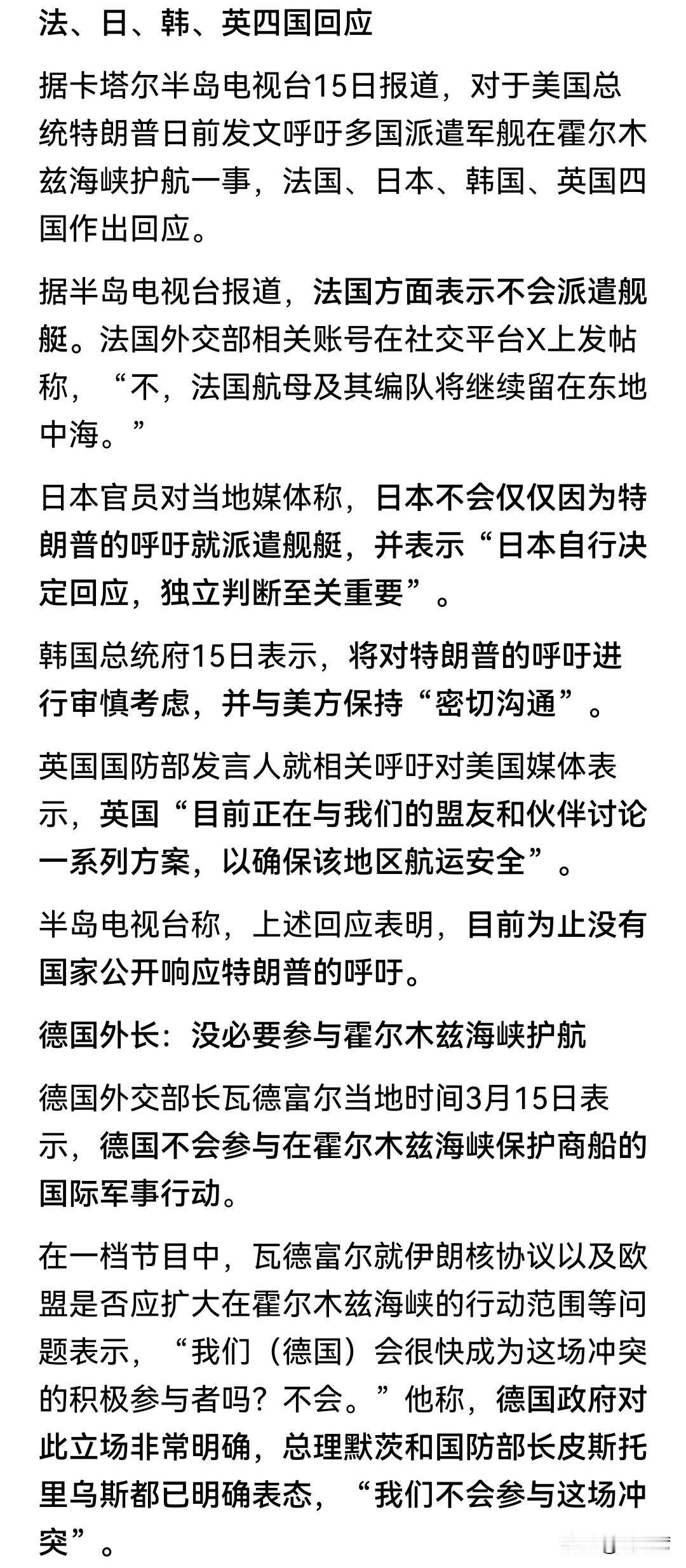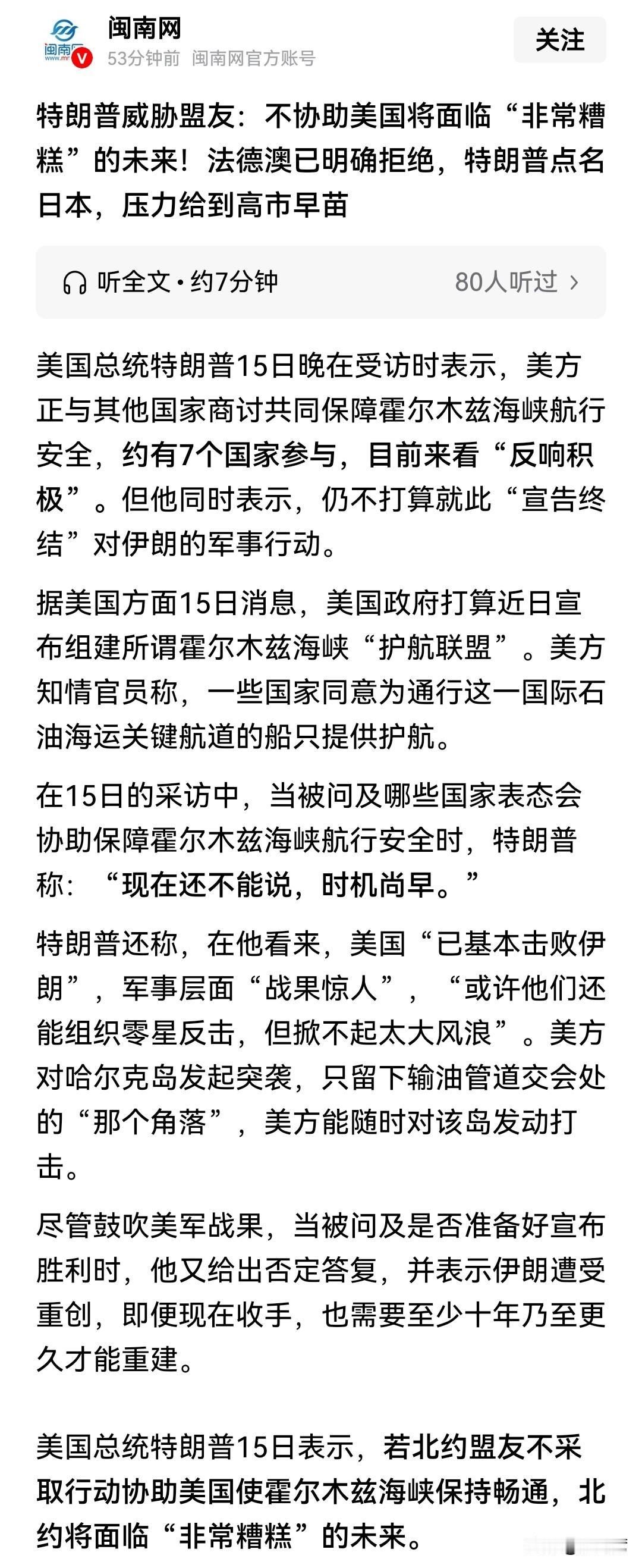 特朗普真的很尴尬! 尽管特朗普对盟友叫嚣和威胁,但盟友们依然都拒绝了。今天的美国真的走到了孤家寡人这一步。特朗普真的太厉害了,以一己之力把全部盟友都得罪了,现在小弟们都不再死忠了,不知特朗普和他的团队们会不会反其道而行之,继续施压、威胁和挥舞着关税大棒,那样会有好戏看了!