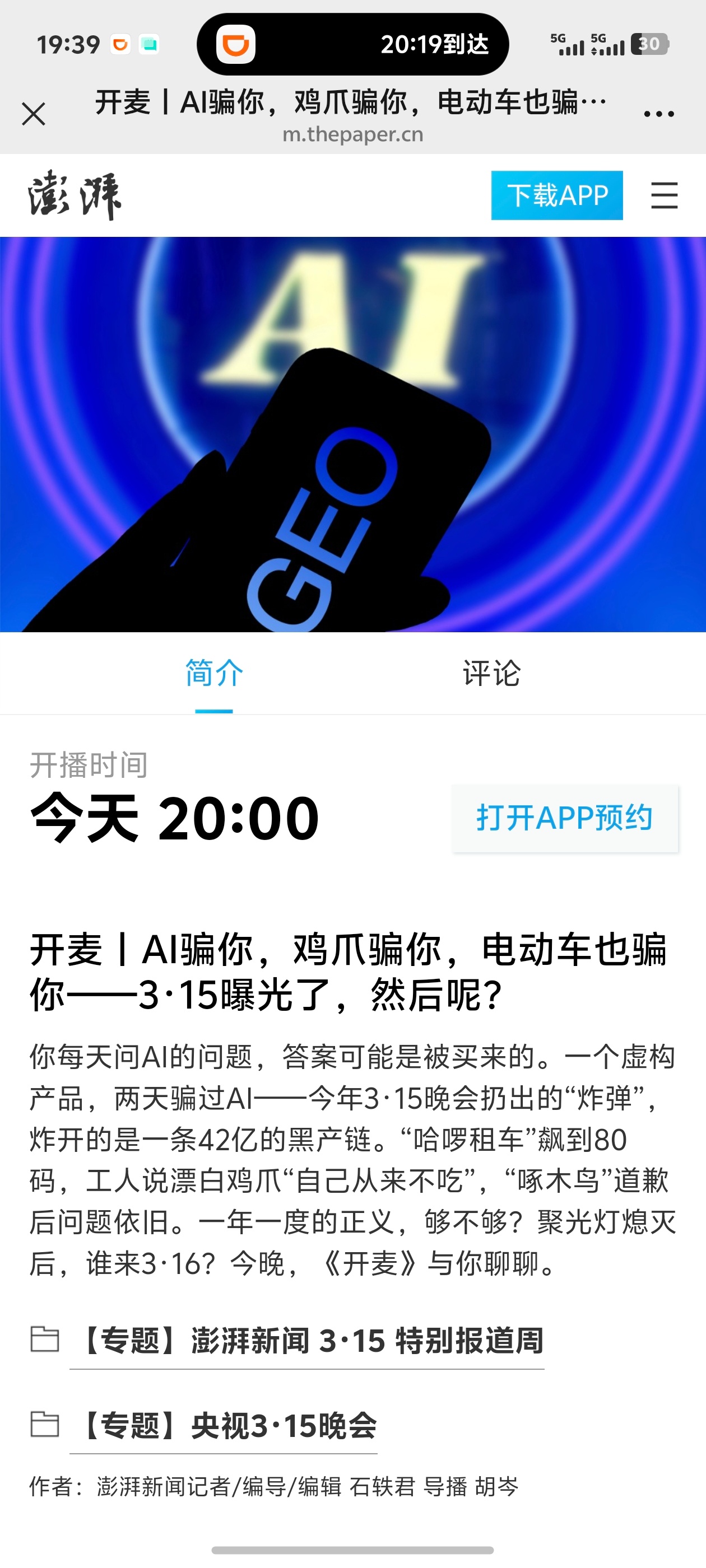接受澎湃新闻的邀请,开麦和中国食品产业分析师朱丹蓬 、北京市中闻律师事务所刑委会副主任张玉锋、澎湃新闻记者石轶君 谈一谈今年315曝光的鸡爪、人工智能投毒GEO、和电动车速度等问题。 上海