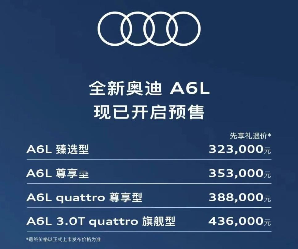 预计全新奥迪A6L的正式起售价,很可能会是30.8万左右,与Q5L保持同等水平。毕竟预售价将原来的起售价拉低10.49万。全新奥迪A6L很可能一改以往的高指导价+高终端优惠,转向进攻性官价+小优惠模式,上市价格就是亮剑时刻。百家车坛