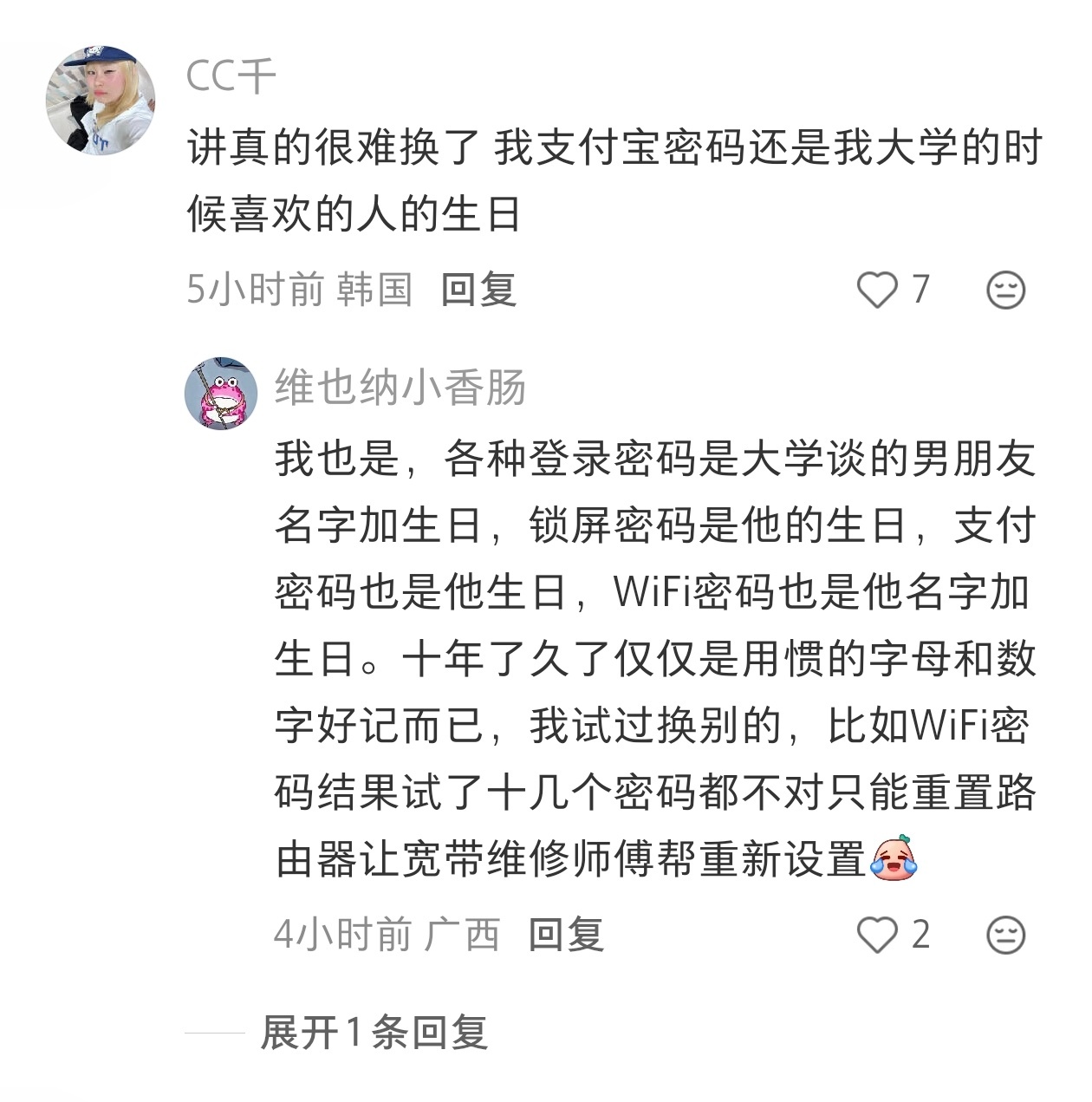 人的某些密码肯定和前任有关系,可能是习惯了懒得改,也可能是还爱他。