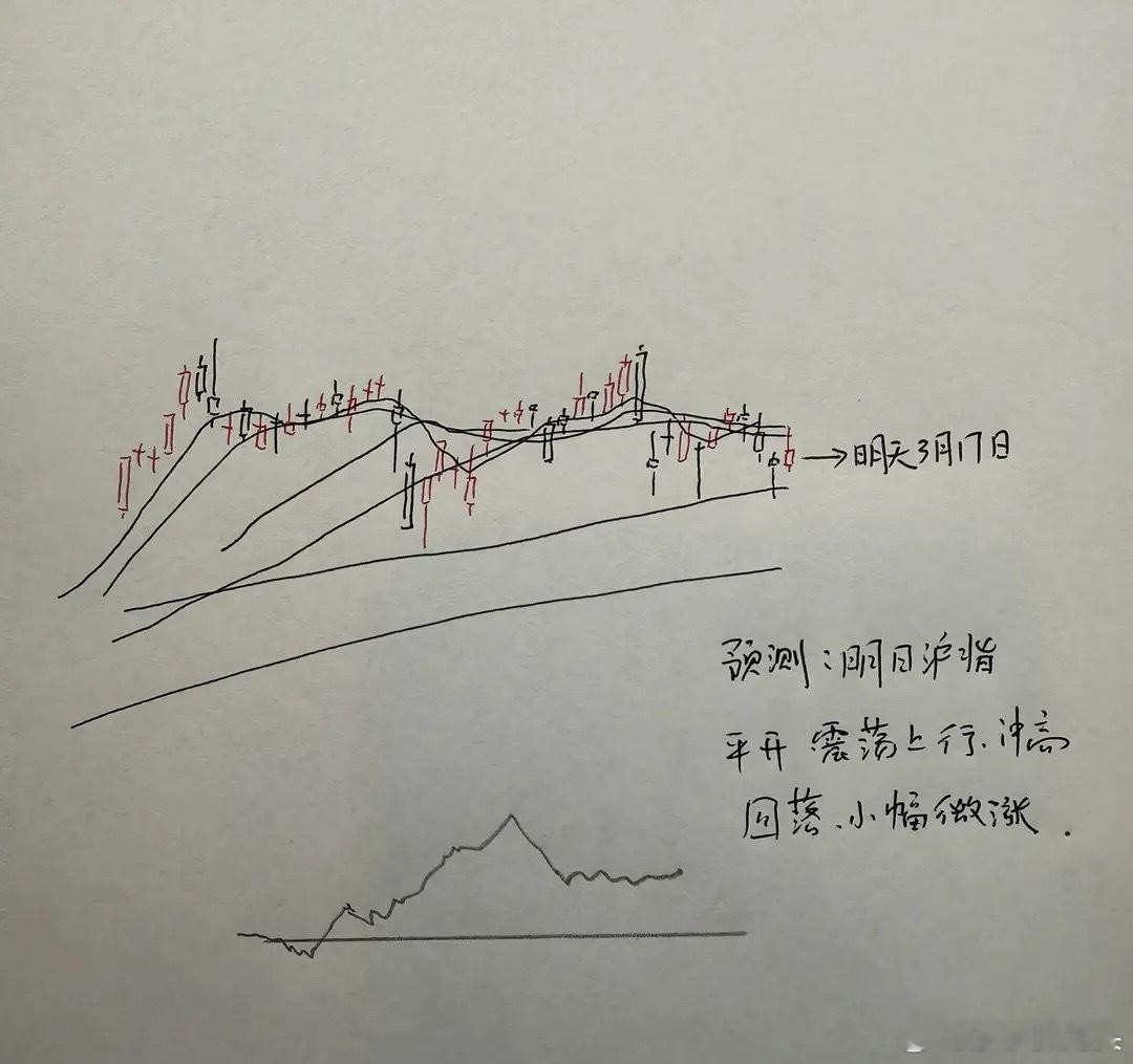 所以综合以上几点分析,对于明天市场走势,莎哥的判断是维持乐观的判断。并且我对于市场接下来变盘的方向,整体的判断是倾向于向上变盘的。那么明天A股到底怎么走?大家请看图三关于明天走势的手绘预测图。
