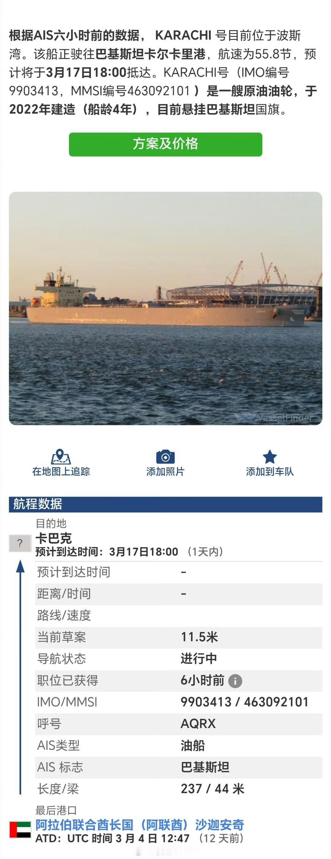 巴基斯坦油轮通过霍尔木兹海峡悬挂巴基斯坦国旗的油轮“卡拉奇”号(IMO 9903413)于3月15日通过霍尔木兹海峡,当时其船舶自动识别系统(AIS)处于开启状态,船上装载着在阿联酋装载的原油,已安全通过。