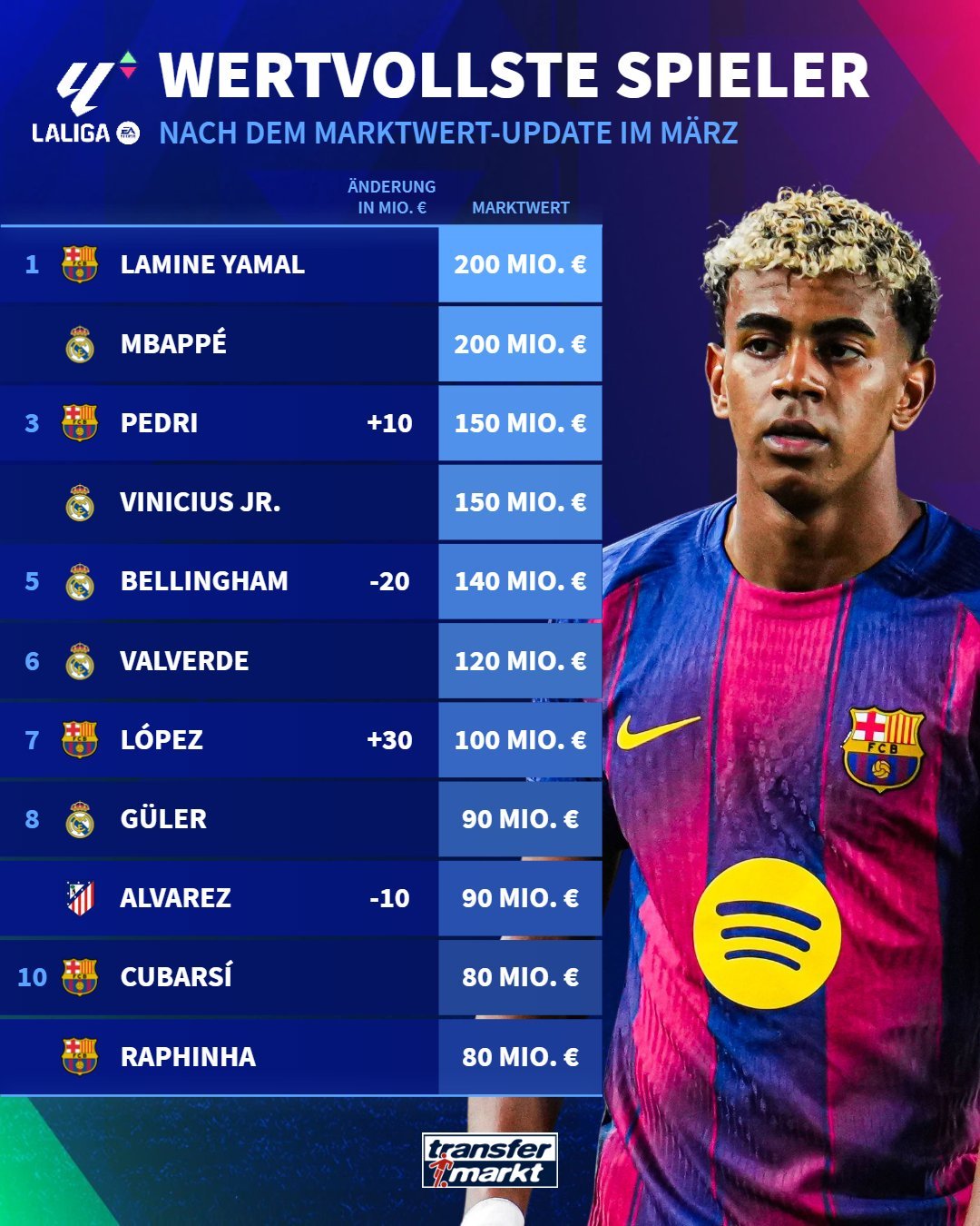 德转最新身价,西甲身价榜,亚马尔身价保持2亿第一,佩德里上涨1000万欧元达到1.5亿排在第三,费尔明上涨3000万欧元达到1亿欧元,库巴西和拉菲尼亚8000万欧元,胡安-加西亚上涨1000万欧元达到4000万欧元,伯纳尔涨了2000万欧元达到3000万欧元,埃里克-加西亚涨了500万欧元达到3500万欧元。📈📈📈📈📈📈📈📈📈📈📈巴萨vs纽卡斯尔联巴萨至死不渝红蓝魂